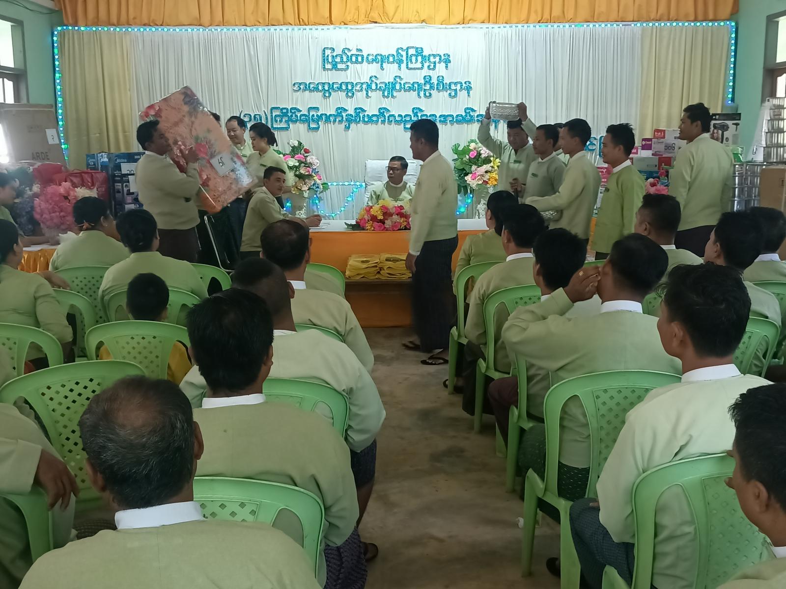 ထို့နောက် ဘူးသီးတောင်မြို့နယ် အထွေထွေအုပ်ချုပ်ရေးဦးစီးဌာနတွင် တာဝန်ထမ်းဆောင်ခဲ့သည့် အငြိမ်းစားဝန်ထမ်းများအား လက်ဆောင်ပစ္စည်းများပေးအပ်ခဲ့ပြီး မုန့်နှင့်လက်ဖက်ရည်များဖြင့် ဧည့်ခံကျွေးမွေးခဲ့ကြသည်။