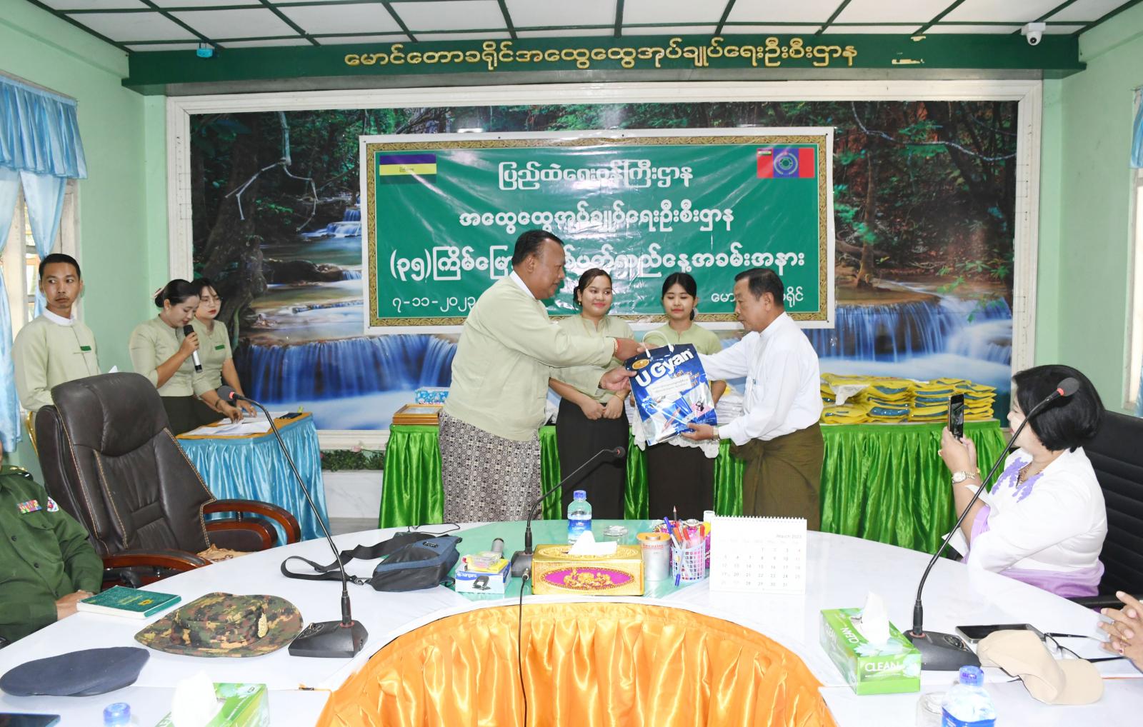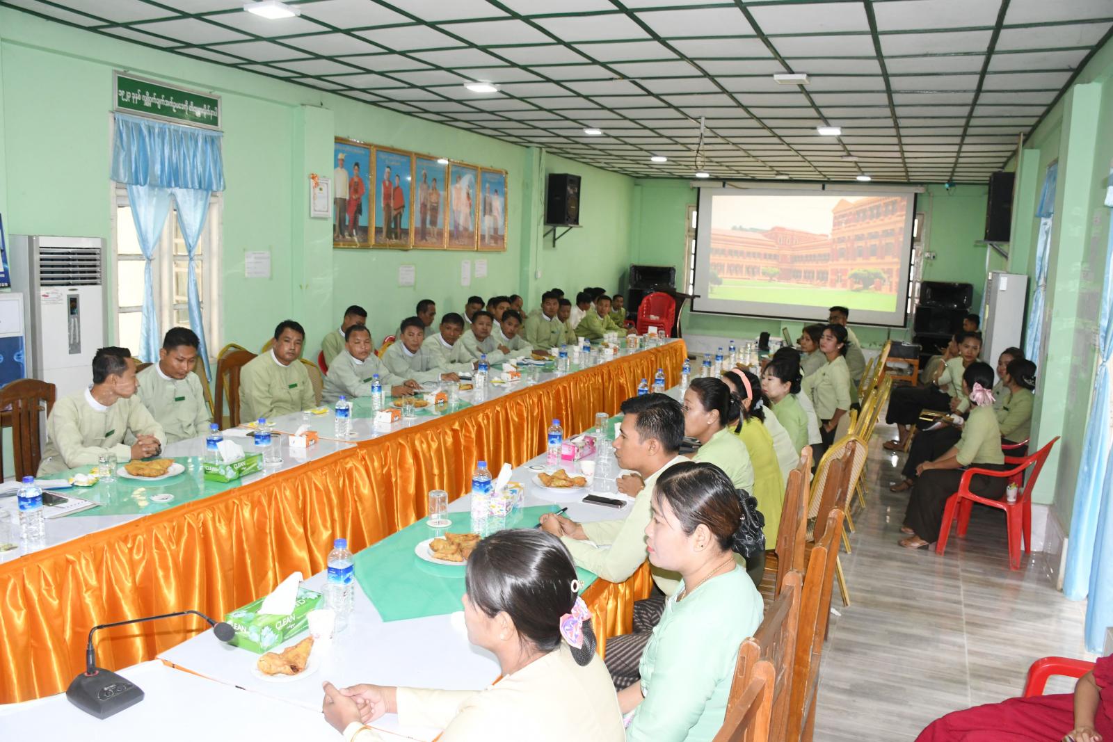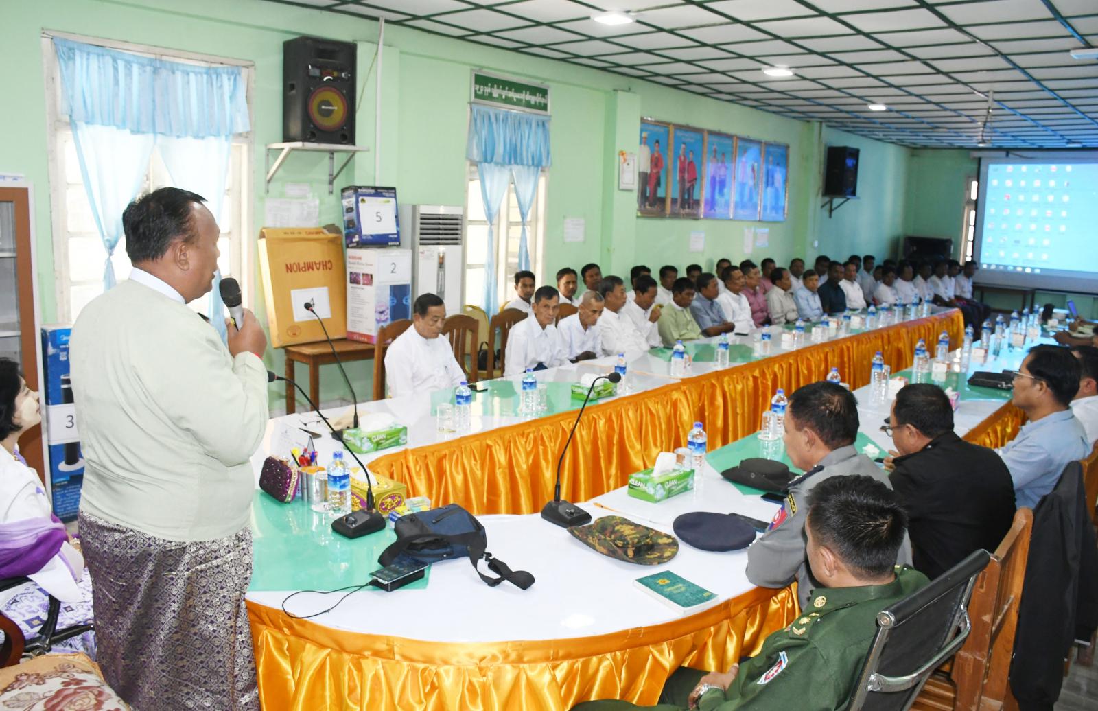 ရှေးဦးစွာ ခရိုင်အုပ်ချုပ်ရေးအဖွဲ့ဥက္ကဋ္ဌ ဦးနေဦးက နိုင်ငံတော်၏ရည်မှန်းချက်များ အောင်မြင်အောင် အကောင်အထည်ဖော် ဆောင်ရွက်ရာတွင် မိမိတို့ဌာနသည် ပြည်သူကိုဗဟိုပြုသည့် ကောင်းမွန်သောအုပ်ချုပ်ရေးယန္တရား တည်ဆောက်ရေး၌ အဓိကကျသောဌာနတစ်ခုဖြစ်ပါကြောင်း၊ ပြည်သူနှင့်တိုက်ရိုက်ထိတွေ့ပြီး ပြည်သူဝန်ဆောင်မှုလုပ်ငန်းများကို ထိရောက်အောင်မြင်စွာ ဆောင်ရွက်ရာတွင် ဉပဒေ၊ နည်းဉပဒေ၊ လုပ်ထုံးလုပ်နည်းများနှင့်အညီ ဆောင်ရွက်ရမည်ဖြစ်ကြောင်း၊ ပြည်သူက ယုံကြည်အားထားသည့် အုပ်ချုပ်ရေးယန္တရားကောင်းဖြစ်စေရန်အတွက် နိုင်ငံတော်နှင့် လူမျိုးဂုဏ်သိက္ခာတို့ကို လေးစားတန်ဖိုးထားပြီး စံနမူနာပြ ဝန်ထမ်းကောင်းများဖြစ်အောင် ကြိုးစားဆောင်ရွက်ရမည်ဖြစ်ကြောင်း၊ သက်ပြည့်ပင်စင်ယူပြီး နိုင်ငံတာဝန်ကို ကျေပွန်စွာထမ်းဆောင်ခဲ့ကြသည့် ဝန်ထမ်းများအား အတုယူကြစေလိုကြောင်းပြောကြားပြီး ဌာန၏ လက်ရှိဆောင်ရွက်နေသည့် အခြေအနေများကို ရှင်းလင်းပြောကြားခဲ့သည်။