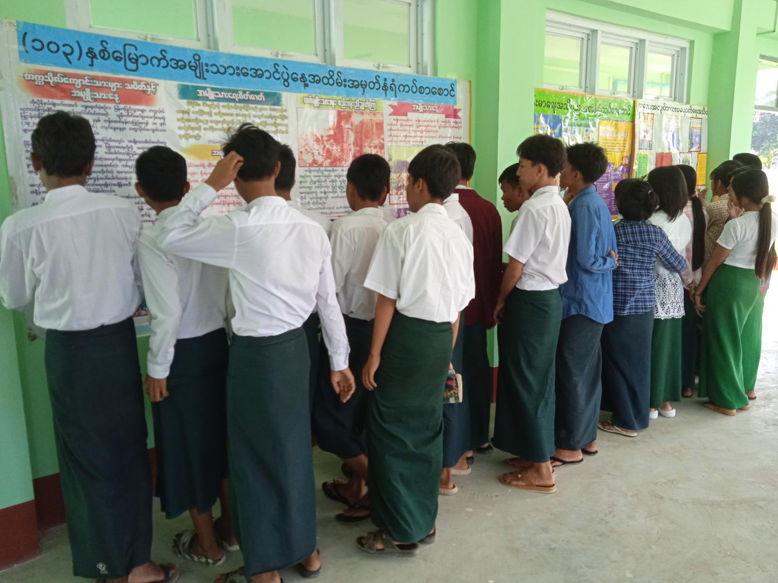 ထို့နောက် ပြန်ကြားရေးနှင့်ပြည်သူ့ဆက်ဆံရေးဦးစီးဌာနမှ ခင်းကျင်းပြသထားသော (၁၀၃)နှစ်မြောက်အမျိုးသားအောင်ပွဲနေ့ အထိမ်းအမှတ် နံရံကပ်စာစောင်၊ ကျန်းမာရေးအသိပညာပေးနံရံကပ်စာစောင်၊ ကလေးအလုပ်သမားပပျောက်ရေးအသိပညာပေး နံရံကပ်စာစောင်များကို ကျောင်းသား/ကျောင်းသူများက စိတ်ဝင်စားစွာ ကြည့်ရှုလေ့လာခဲ့ကြောင်း သိရသည်။