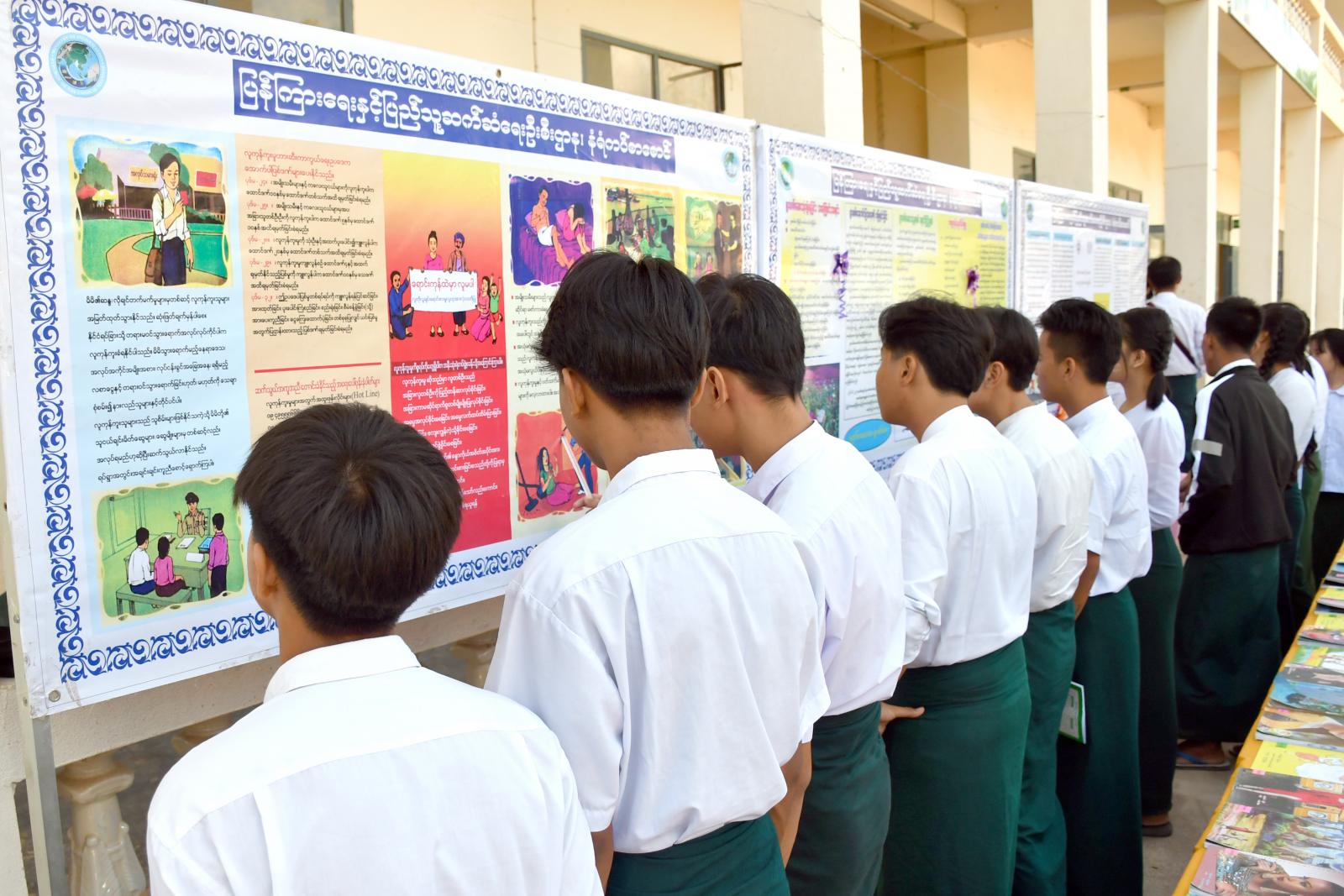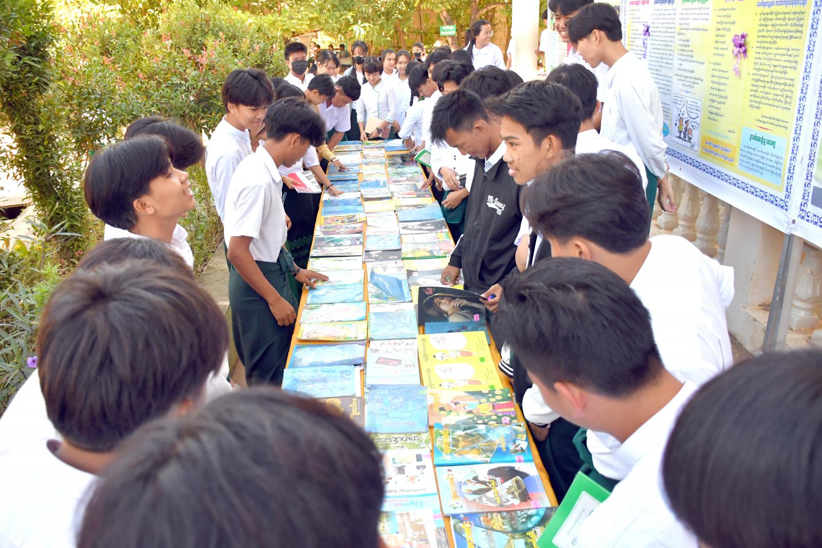 ထို့နောက် ပြန်ကြားရေးနှင့်ပြည်သူ့ဆက်ဆံရေးဦးစီးဌာနက ခင်းကျင်းပြသထားသည့် လူငယ်အသိပညာပေး နံရံကပ်စာစောင်နှင့် စာအုပ်စာစောင်များကို ကျောင်းသား၊ ကျောင်းသူများက စိတ်ပါဝင်စားစွာ ဖတ်ရှုလေ့လာခဲ့ကြကြောင်း သိရသည်။