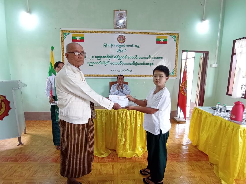 ရခိုင်ပြည်နယ်၊ သံတွဲခရိုင်၊ ဂွမြို့တွင် မြို့နယ် စစ်မှုထမ်းဟောင်းအဖွဲ့မှ ၂၀၂၃-၂၀၂၄ ပညာသင်နှစ် အဖွဲ့ဝင်များ၏ သားသမီးများအား ပညာသင် ထောက်ပံ့ကြေး ပေးအပ်ပွဲကို ယမန်နေ့နံနက်ပိုင်းက မြို့နယ်စစ်မှုထမ်းဟောင်းအဖွဲ့ခန်းမတွင် ကျင်းပပြုလုပ်ခဲ့သည်။
