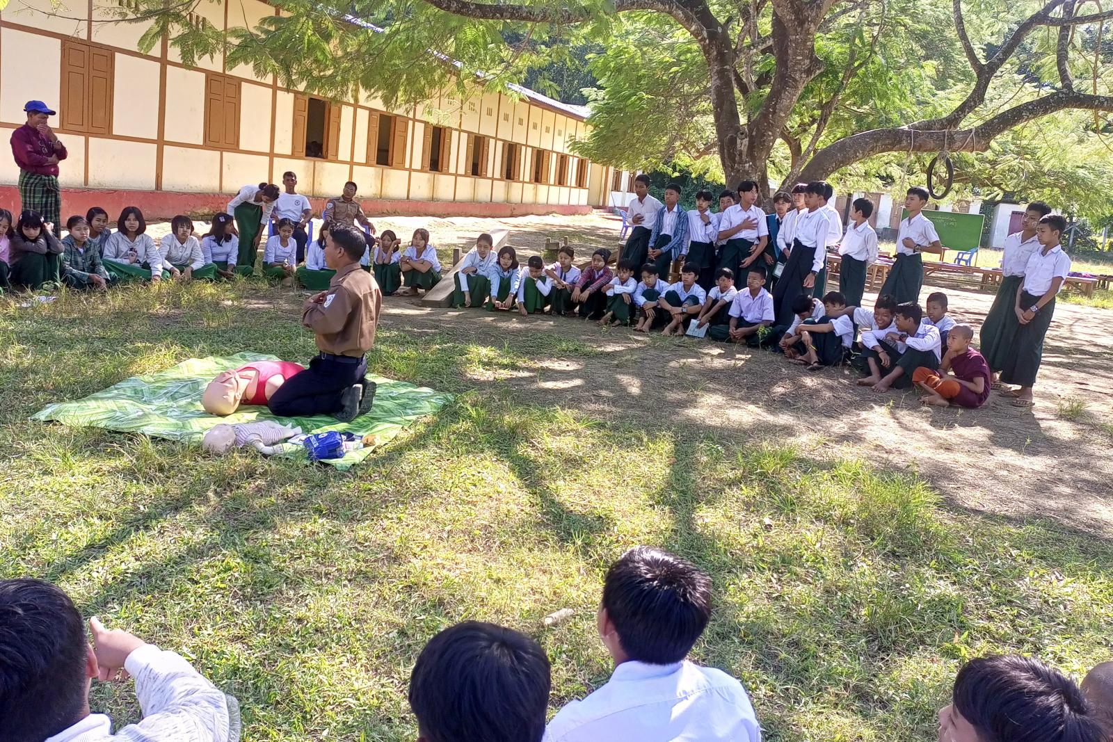ကျောင်းသား၊ ကျောင်းသူများ အသင်းအဖွဲ့များနှင့် ပူးပေါင်းဆောင်ရွက်တတ်ခြင်းဖြင့် သဘာဝဘေးအန္တရာယ်များနှင့် ထိခိုက်ဒဏ်ရာရရှိသူများကို ကယ်တင်နိုင်သည့် ရှေးဦးပြုစုခြင်း အခြေခံပညာရပ်ကို ကချင်ပြည်နယ်၊ မိုးညှင်းခရိုင်၊ မိုကောင်းမြို့နယ် အ.လ.က-သူဌေးကုန်းကျောင်း၌ ယမန်နေ့ နံနက်(၉)နာရီတွင် သင်ကြားပေးလျက်ရှိကြောင်း သိရသည်။