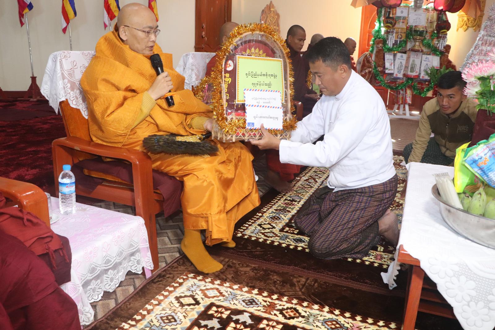 ထို့နောက် ချင်းပြည်နယ်လုံခြုံရေးနှင့်နယ်စပ်ရေးရာဝန်ကြီးဗိုလ်မှူးကြီးသိန်းထွန်းအောင်က ၁၃၈၅ ခုနှစ်ခု၊ စုပေါင်းမဟာဘုံကထိန် ကထိန်ခံကျောင်းဖြစ်သော ဟားခါးမြို့၊ ဇေတဝန်တောရ စာသင်တိုက်နှင့် တရားဓမ္မရိပ်သာကျောင်းတိုက်၏ ဦးစီးပဓာန နာယကဆရာတော် ဒေါက်တာဘဒ္ဒန္တတေဇောသာရ အရှင်သူမြတ်အား ကထိန်လျာဉာတ်သင်္ကန်းနှင့် လှူဖွယ်ဝတ္ထု ပစ္စည်းများကိုလည်းကောင်း၊ ဟားခါး-ထန်တလန်မြို့နယ် သံဃနာယကအဖွဲ့ဥက္ကဌ၊ ဟားခါးမြို့၊ ကျောဘုတ်သာသနာပြုကျောင်းဆရာတော်ဘဒ္ဒန္တပညောဘာသ အရှင်သူမြတ်အား ချင်းပြည်နယ် တရားလွှတ်တော်တရားသူကြီး ချုပ်ဦးနေစိုးကလည်းကောင်း၊ ကျန်သံဃာတော် ( ၇ ) ပါးနှင့် သီလရှင် (၃)ပါးတို့အား ပြည်နယ်အစိုးရအဖွဲ့ဝင်ဝန်ကြီးများနှင့် ပြည်နယ်အဆင့်ဌာနဆိုင်ရာအကြီးအကဲများ က အရံသင်္ကန်း၊ သီလရှင်ဝတ်စုံနှင့် လှူဖွယ်ပစ္စည်းများ ဆက်ကပ် လှူဒါန်းကြသည်။