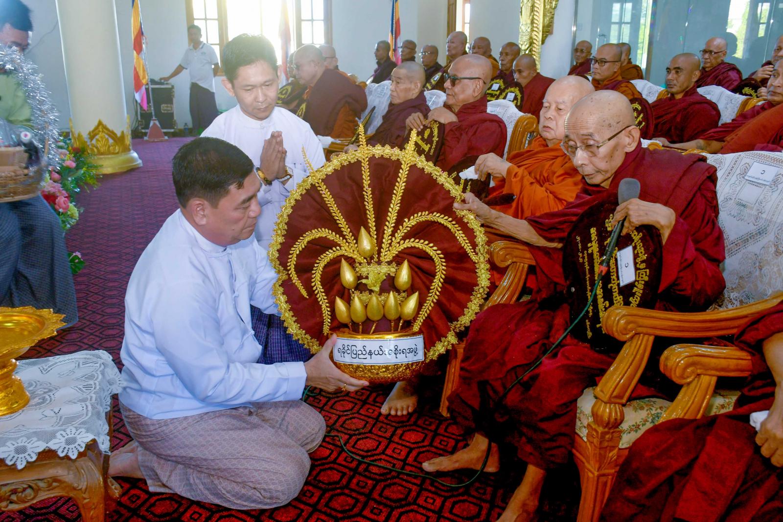 ထို့နောက် ပြည်နယ်ဝန်ကြီးချုပ် ဦးထိန်လင်းက ဘုရားတပည့်တော်များအနေဖြင့် ဝါဆိုကာလ၌ ဝါဆိုသင်္ကန်းများ လှူဒါန်းခြင်း၊ ဝါတွင်းကာလဆွမ်းဆန်စိမ်းများ လောင်းလှူခြင်း၊ မိုခါဆိုင်ကလုန်း မုန်တိုင်းကြောင့် ပျက်စီးသွားသော ဘုရားကျောင်းကန်၊ စေတီပုထိုးသာသနိက အဆောက်အဦများကို ပြန်လည်ပြုပြင်နိုင်ရန် လိုအပ်သည့် သွပ်၊ သစ်၊ သံ၊ ဘိလပ်မြေတို့ကို လှူဒါန်းခြင်း၊ ယခုကထိန်ကာလ၌လည်း ကထိန်သင်္ကန်းများနှင့် အခြံအရံလှူဖွယ်ဝတ္ထုများ လှူဒါန်းခြင်းစသော ကာလဒါန၊ ထာဝရဒါန ကုသိုလ်ကောင်းမှုများ ပြုလုပ်လျက် မြတ်ဗုဒ္ဓသာသနာတော်မြတ်ကြီးကို ပစ္စယာနုဂ္ဂဟအားဖြင့် ထောက် ပံ့ပူဇော်လျက်ရှိကြောင်း၊ ယနေ့ကျင်းပပြုလုပ်သော စုပေါင်းဘုံကထိန်အခမ်းအနား၌ ရခိုင်ပြည်နယ် အစိုးရအဖွဲ့နှင့် ဌာနဆိုင်ရာများ၊ လူမှုရေးအသင်းအဖွဲ့များ၊ မြို့မိ၊ မြို့ဖများ၊ စေတနာရှင်များမှ စုပေါင်းလှူဒါန်းသော ပဒေသာပင် (၄၄) ပင်နှင့် စုစုပေါင်းလှူဒါန်းမှုတန်ဖိုးမှာ (၄၅၆၅၈၅၀၀) ကျပ်တိတိ ဖြစ်ကြောင်း နတ်လူသာဓု ခေါ်ဆိုနိုင်ရန် တင်ပြလျှောက်ထားသည်။