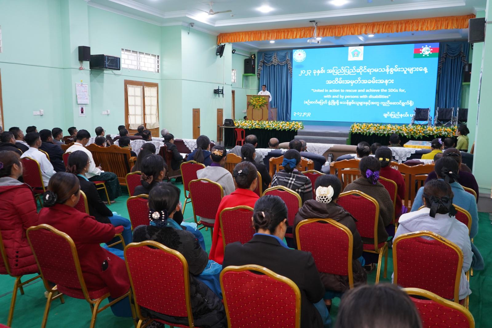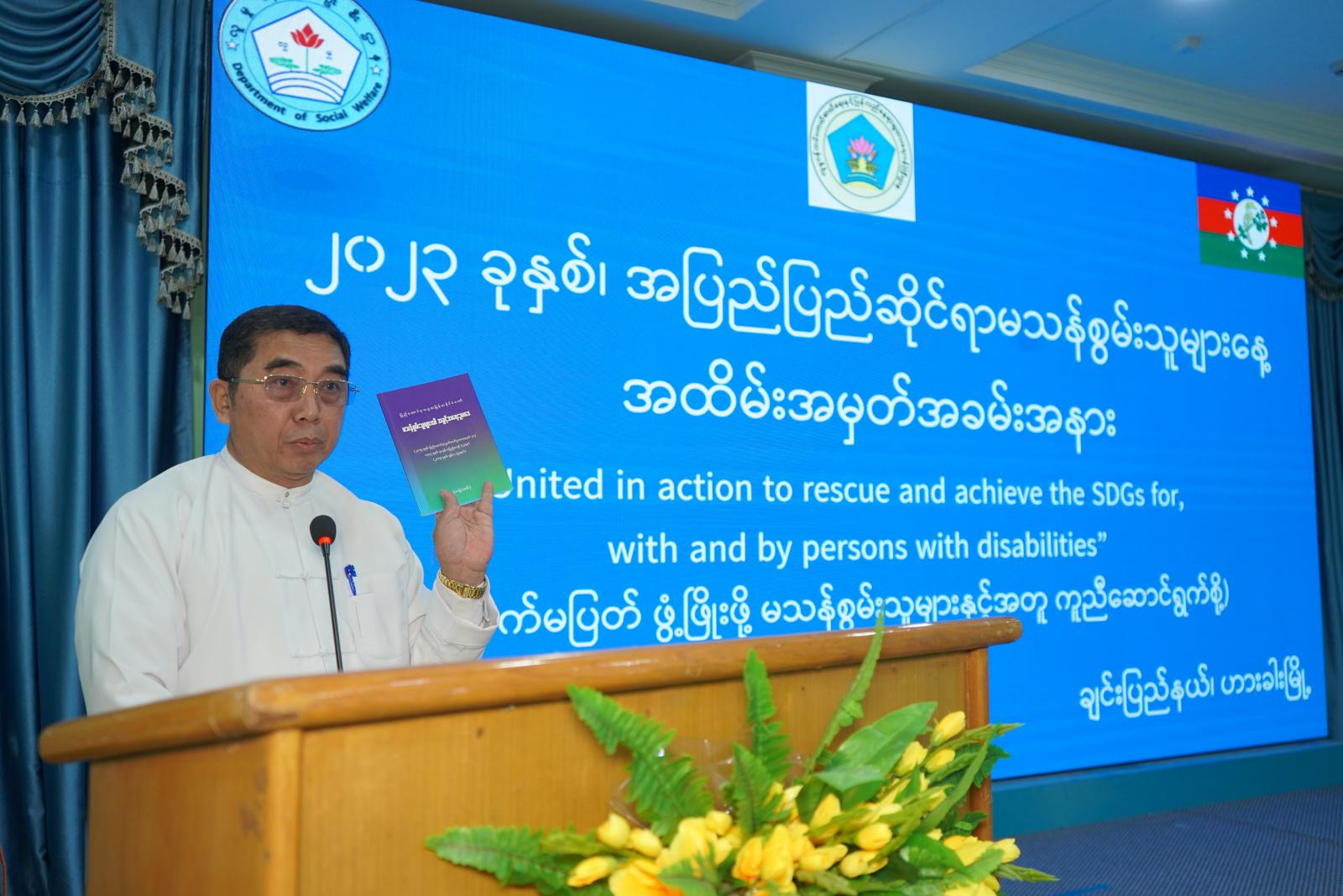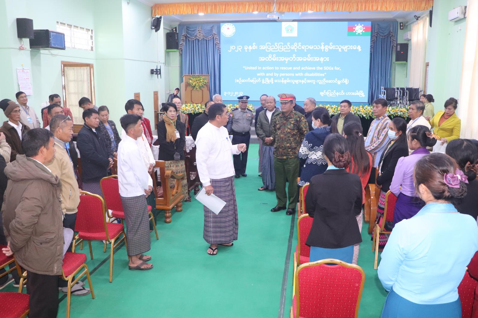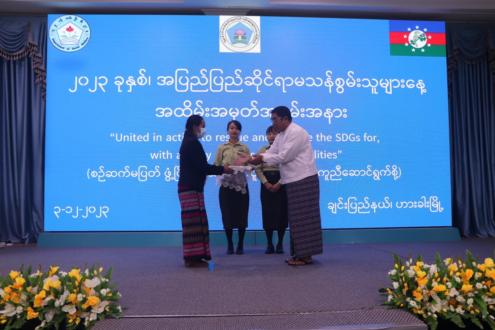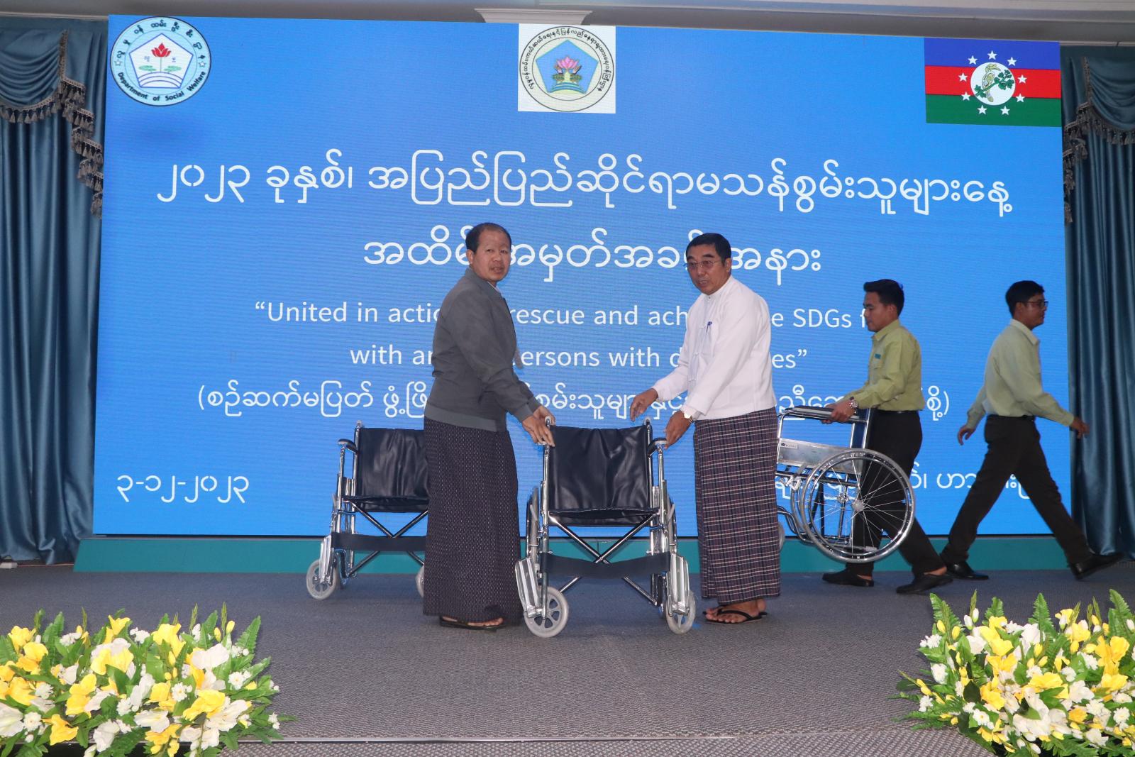 ထို့နောက် UN မှ ပေးပို့လာသော Video Message နှင့် Video clip ကို ဖွင့်လှစ်ပြသပြီး ပြည်နယ်ဝန်ကြီးချုပ် ဒေါက်တာဝုန်ဆွန်းထန်က မသန်စွမ်းသူများကို အားပေးချီးမြှင့်ခြင်းနှင့် ပြည်နယ်လူမှုဝန်ထမ်းဦးစီးဌာနရုံးမှ လှူဒါန်းသော Wheelchair (၅) စီးအား ပေးအပ်လှူဒါန်းရာ မသန်စွမ်းများကိုယ်စား မသန်စွမ်းသူနှစ်ဦးနှင့် ဟားခါးပြည်သူ့ဆေးရုံအုပ် ဒေါက်တာမောင်မောင်ဝင်း တို့က လက်ခံရယူပြီး ပြည်နယ်ဝန်ကြီးချုပ်က အခမ်းအနားသို့ တက်ရောက်လာကြသည့် မသန်စွမ်းသူများနှင့် ပြည်နယ်အဆင့် တာဝန်ရှိသူများအား အားပေးစကား ပြောကြားခဲ့ကြောင်း သိရသည်။