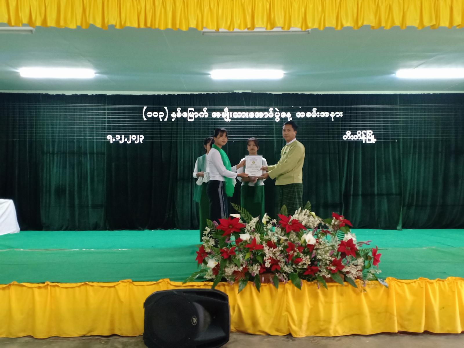 ဆက်လက်၍ (၁၀၃)နှစ်မြောက် အမျိုသားအောင်ပွဲနေ့ အထိမ်းအမှတ် အခြေခံပညာ အထက်တန်းအဆင့်၊ အလယ်တန်းအဆင့်နှင့် မူလတန်းအဆင့် စာစီစာကုံး၊ ကဗျာနှင့် ကျပန်းပြိုင်ပွဲများမှ ဆုရကျောင်းသား၊ ကျောင်းသူများအား ခရိုင်စီမံအုပ်ချုပ်ရေးအဖွဲ့ဥက္ကဋ္ဌနှင့် အဖွဲ့ဝင်များ မြို့နယ်စီမံအုပ်ချုပ်ရေးအဖွဲ့ဥက္ကဋ္ဌ ဦးဖြိုးဝင်းသန်းနှင့် အဖွဲ့ဝင်များ၊ ခရိုင်နှင့် မြို့နယ်အဆင့် ဌာနဆိုင်ရာတာဝန်ရှိသူများက ဆုများချီးမြှင့်ကြကာ ကျောင်းသား၊ ကျောင်းသူများက “မြန်မာ့ကျောင်း” သီချင်း သီဆိုဖျော်ဖြေကြသည်။