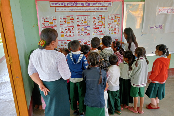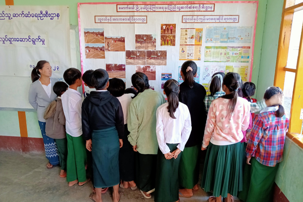 ဆက်လက်ပြီး ကျောင်းသား/ကျောင်းသူများက မြို့နယ်ပြန်ကြားရေးနှင့်ပြည်သူ့ဆက်ဆံရေးဦးစီးဌာနမှ အခြေခံပညာမူလတန်းကျောင်း၌ ခင်းကျင်းပြသ ထားသော သဘာဝဘေးအန္တရာယ်နှင့် လူငယ်ရေးရာ အသိပညာပေးဓါတ်ပုံနှင့် နံရံကပ်စာစောင်များကို စိတ်ပါဝင်စားစွာ ကြည့်ရှုခဲ့ကြကြောင်း သိရသည်။