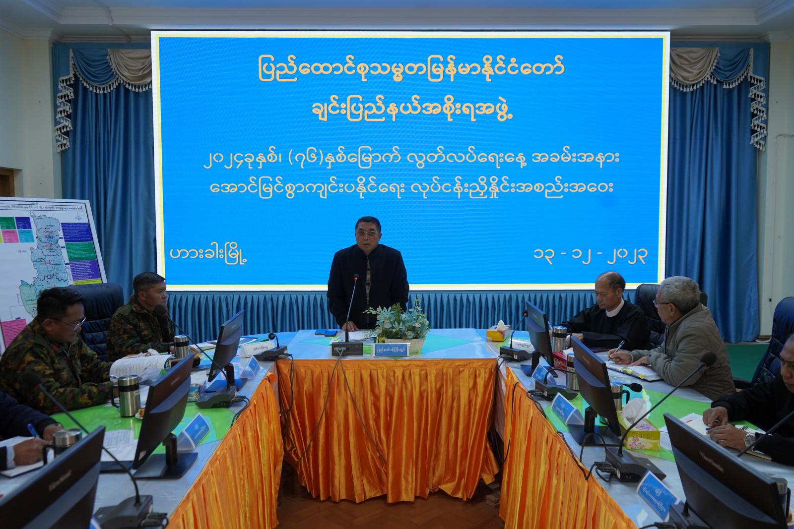 ယင်းနောက် (၇၆) နှစ်မြောက် လွတ်လပ်ရေးနေ့အခမ်းအနား အောင်မြင်စွာကျင်းပနိုင်ရေး ဦးစီးကော်မတီဥက္ကဋ္ဌ၊ ပြည်နယ်လူမှုရေးရာဝန်ကြီးဦးကျော်စိုးဝင်းက ၂၀၂၃ ခုနှစ်၊ (၇၅)နှစ်မြောက် လွတ်လပ်ရေးအခမ်းအနားကျင်းပမှုအခြေအနေနှင့် လာမည့်နှစ်တွင်ကျင်းပပြုလုပ်မည့် လွတ်လပ်ရေးနေ့အခမ်းအနား အောင်မြင်စွာကျင်းပနိုင်ရေးအတွက် ဆောင်ရွက်ထားရှိမှု အခြေအနေနှင့် ဆက်လက်ဆောင်ရွက်မည့် အစီအမံများကို ရှင်းလင်းတင်ပြကြသည်။