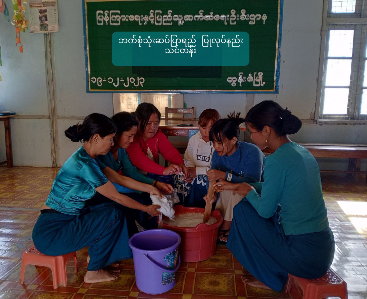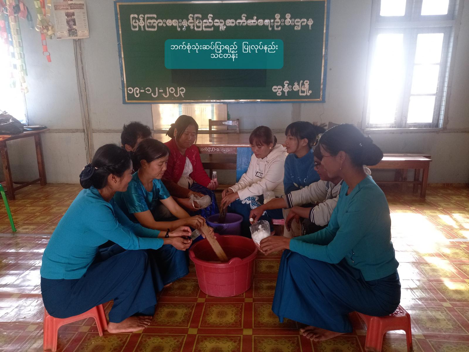 ဆက်လက်၍ နည်းပြနှင့်အတူ သင်တန်းသား၊ သင်တန်းသူ(၈)ဦးတို့က မိသားစုအတွက် တစိတ်တဒေသ အထောက်အကူဖြစ်စေမည့် ကုန်ကျစရိတ်သက်သာ၍ များစွာအသုံးပြုနိုင်သော ဘက်စုံသုံးဆပ်ပြာရည်များ ပြုလုပ်ခဲ့ကြောင်း သိရသည်။