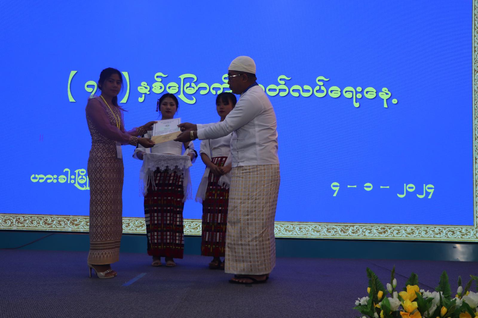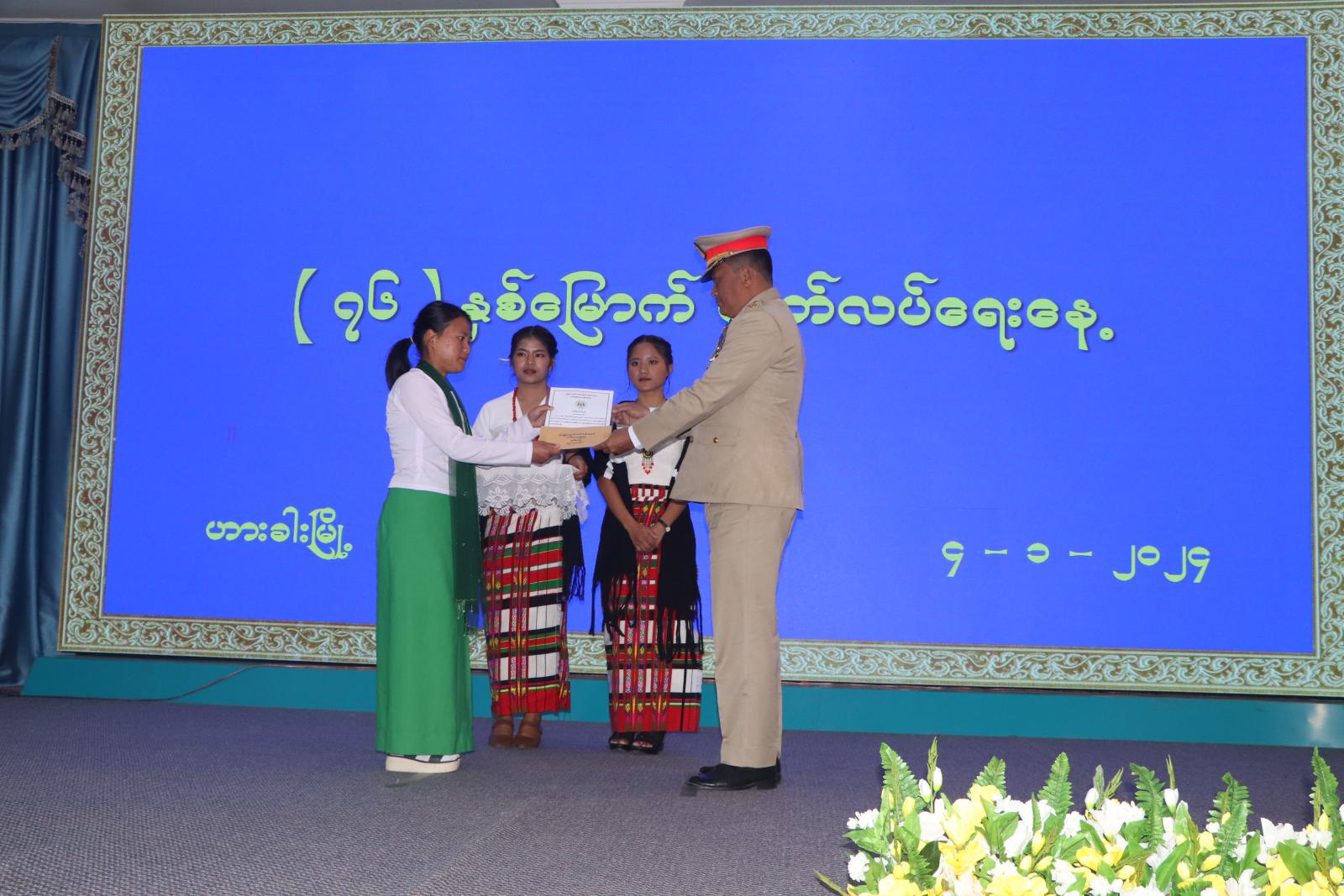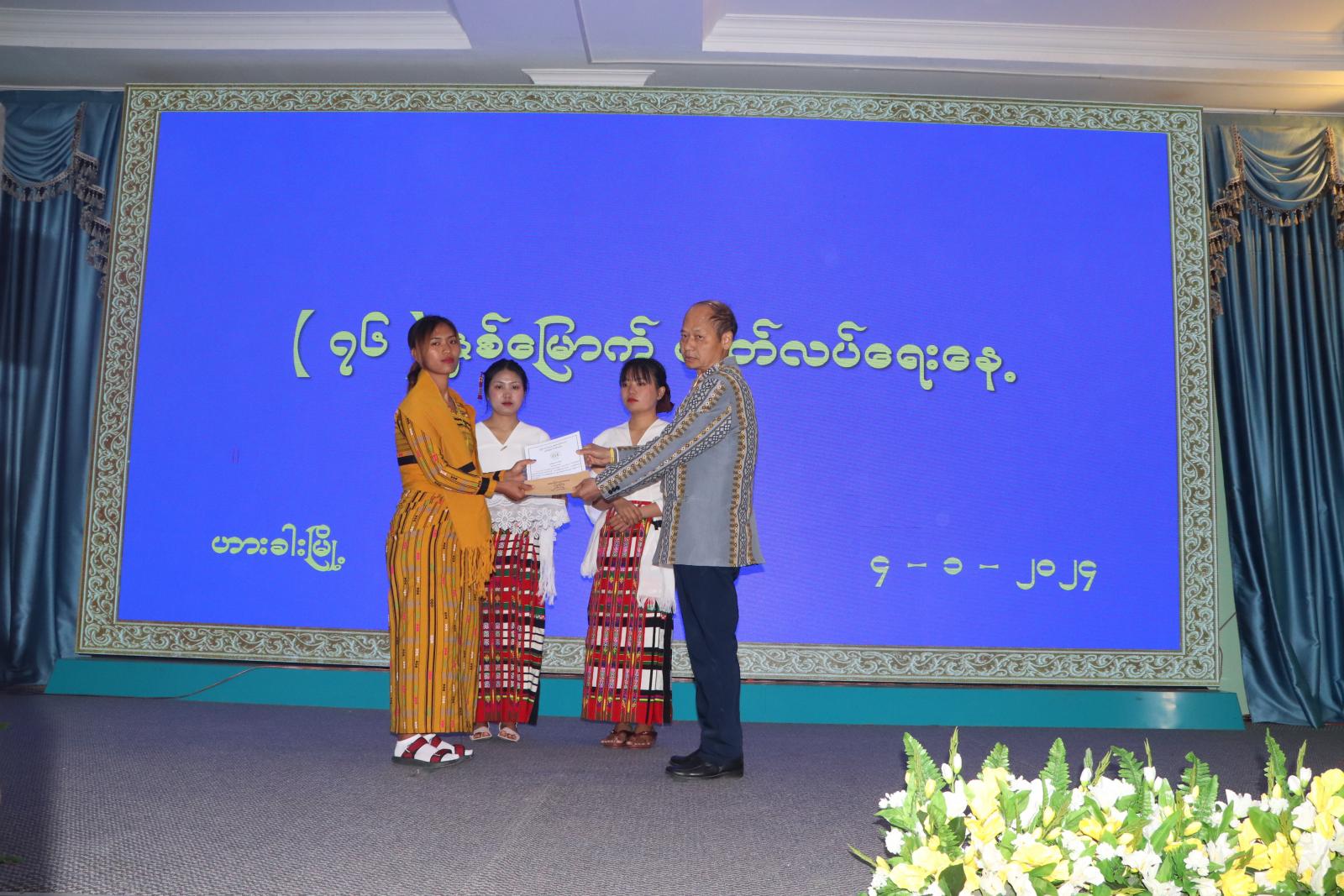 ထို့နောက် (၇၆) နှစ်မြောက် လွတ်လပ်ရေးအနေ့အထိမ်းအမှတ် စာစီစာကုံး၊ ကဗျာ၊ ကျပန်းစကားပြောပြိုင်ပွဲနှင့် အားကစားပြိုင်ပွဲများတွင် ဆုရရှိသူများအား ဆုချီးမြှင့်ခြင်းအခမ်းအနား ဆက်လက်ကျင်းပရာ အဆင့်မြင့်ပညာအဆင့် စာစီစာကုံးပြိုင်ပွဲတွင် ဆုရရှိသူများအား ပြည်နယ် ဝန်ကြီးချုပ်ကလည်းကောင်း၊ အဆင့်မြင့်ပညာ ကဗျာပြိုင်ပွဲတွင် ဆုရရှိသူများအား ပြည်နယ် လွှတ်တော်တရားသူကြီးချုပ်ကလည်းကောင်း၊ အဆင့်မြင့်ပညာ ကျပန်းစကားပြောပြိုင်ပွဲတွင် ဆုရရှိသူများအား အနောက်မြောက်တိုင်းစစ်ဌာနချုပ်မှ ဗိုလ်မှူးချုပ် နိုင်ဝင်းအောင်ကလည်းကောင်း၊ အခြေခံပညာ(အထက်တန်း) အဆင့်စာစီစာကုံးပြိုင်ပွဲတွင် ဆုရရှိသူများအား ပြည်နယ်လုံခြုံရေးနှင့် နယ်စပ်ရေးရာဝန်ကြီး ဗိုလ်မှူးကြီး သိန်းထွန်းအောင် ကလည်းကောင်း၊ အခြေခံပညာ(အထက်တန်း) အဆင့် ကဗျာပြိုင်ပွဲတွင် ဆုရရှိသူများအား ပြည်နယ်စီးပွားရေးရာဝန်ကြီး ဦးဟန်ကျင့်ဇမ်း ကလည်းကောင်း၊ အခြေခံပညာ(အလယ်တန်း) အဆင့် စာစီစာကုံးပြိုင်ပွဲတွင် ဆုရရှိသူများအား ပြည်နယ်သယံဇာတရေးရာဝန်ကြီး ဦးကျော်ငြိမ်းက လည်းကောင်း၊ အခြေခံပညာ(အလယ်တန်း) အဆင့် ကဗျာပြိုင်ပွဲတွင် ဆုရရှိသူများအား ပြည်နယ်လူမှုရေးရာဝန်ကြီး ဦးကျော်စိုးဝင်းက လည်းကောင်း၊ စားပွဲတင်တင်းနစ်ပြိုင်ပွဲ(တစ်ဦးချင်း)ပြိုင်ပွဲတွင် ဆုရရှိသူများအား ပြည်နယ်လမ်းပန်း ဆက်သွယ်ရေးဝန်ကြီး ရဲမှူးကြီး စိုးလွင်မိုးက လည်းကောင်း၊ စစ်တုရင်( အလွတ်တန်း ) ပြိုင်ပွဲတွင် ဆုရရှိသူများအား ပြည်နယ်ဥပဒေချုပ် ဦးဆွန်ဒုတ်ကျင်က လည်းကောင်းဆုများ အသီးသီး ပေးအပ်ချီးမြှင့်ကြပြီး ပြည်နယ်ဝန်ကြီးချုပ်က အခမ်းအနားသို့တက်ရောက်လာကြသည့် ပြည်နယ် အဆင့် ဌာနဆိုင်ရာတာဝန်ရှိသူများနှင့်ဧည့်သည်တော်များအား ရင်းရင်းနှီးနှီးနှုတ်ဆက်ကာ ဆုရရှိသူများ၊ တိုင်းရင်းသားအဖွဲ့များနှင့် စုပေါင်းအမှတ်တရ မှတ်တမ်းဓာတ်ပုံရိုက်ကူးခဲ့ကြောင်း သိရသည်။