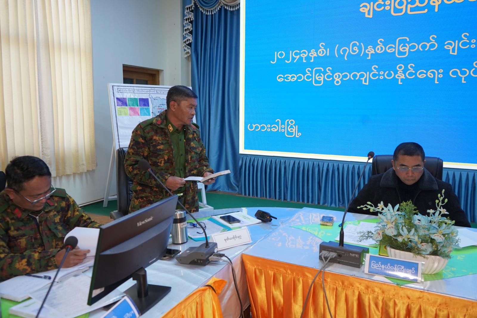 ယင်းနောက် အနောက်မြောက်တိုင်းစစ်ဌာနချုပ်မှ ဗိုလ်မှူးချုပ်နိုင်ဝင်းအောင်က လုံခြုံရေးဆိုင်ရာ ကိစ္စရပ်များကိုလည်းကောင်း၊ (၇၆)နှစ်မြောက် ချင်းအမျိုးသားနေ့အောင်မြင်စွာကျင်းပနိုင် ရေးဦးစီးကော်မတီဥက္ကဋ္ဌ ပြည်နယ်လုံခြုံရေးနှင့်နယ်စပ်ရေးရာဝန်ကြီး ဗိုလ်မှူးကြီး သိန်းထွန်းအောင်က (၇၆)နှစ်မြောက် ချင်းအမျိုးသားနေ့အောင်မြင်စွာ ကျင်းပနိုင်အတွက် စီမံဆောင်ရွက်ထားရှိမှု အခြေအနေများကိုလည်းကောင်း ရှင်းလင်းတင်ပြကြသည်။