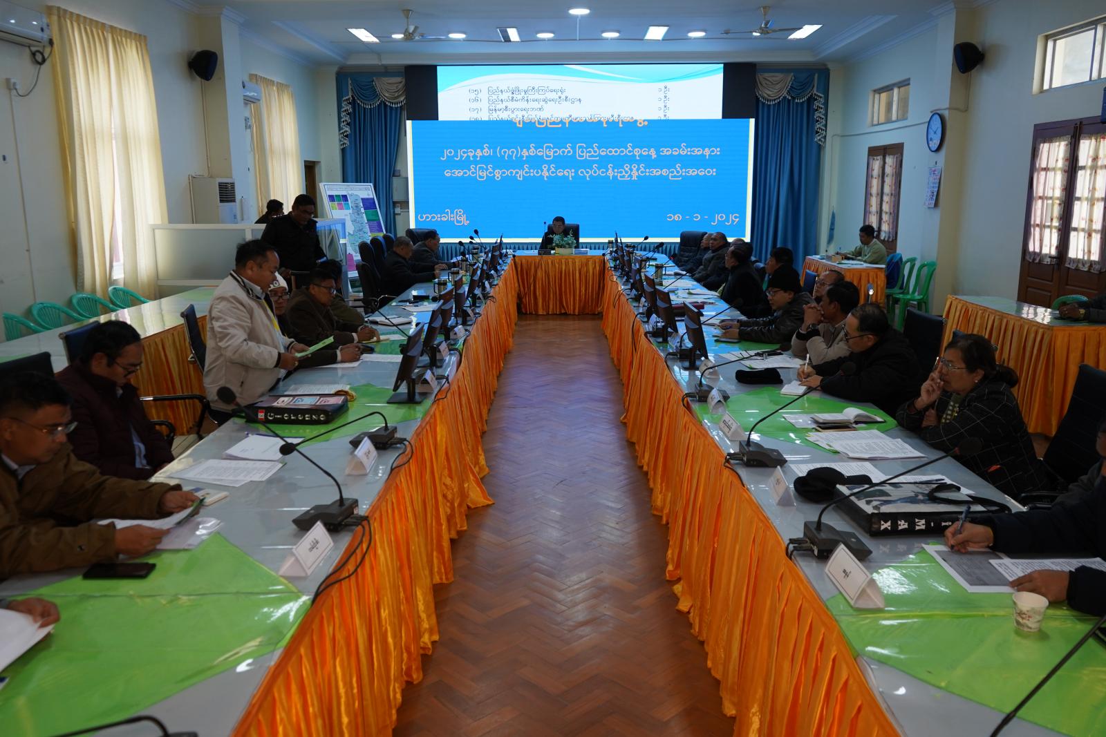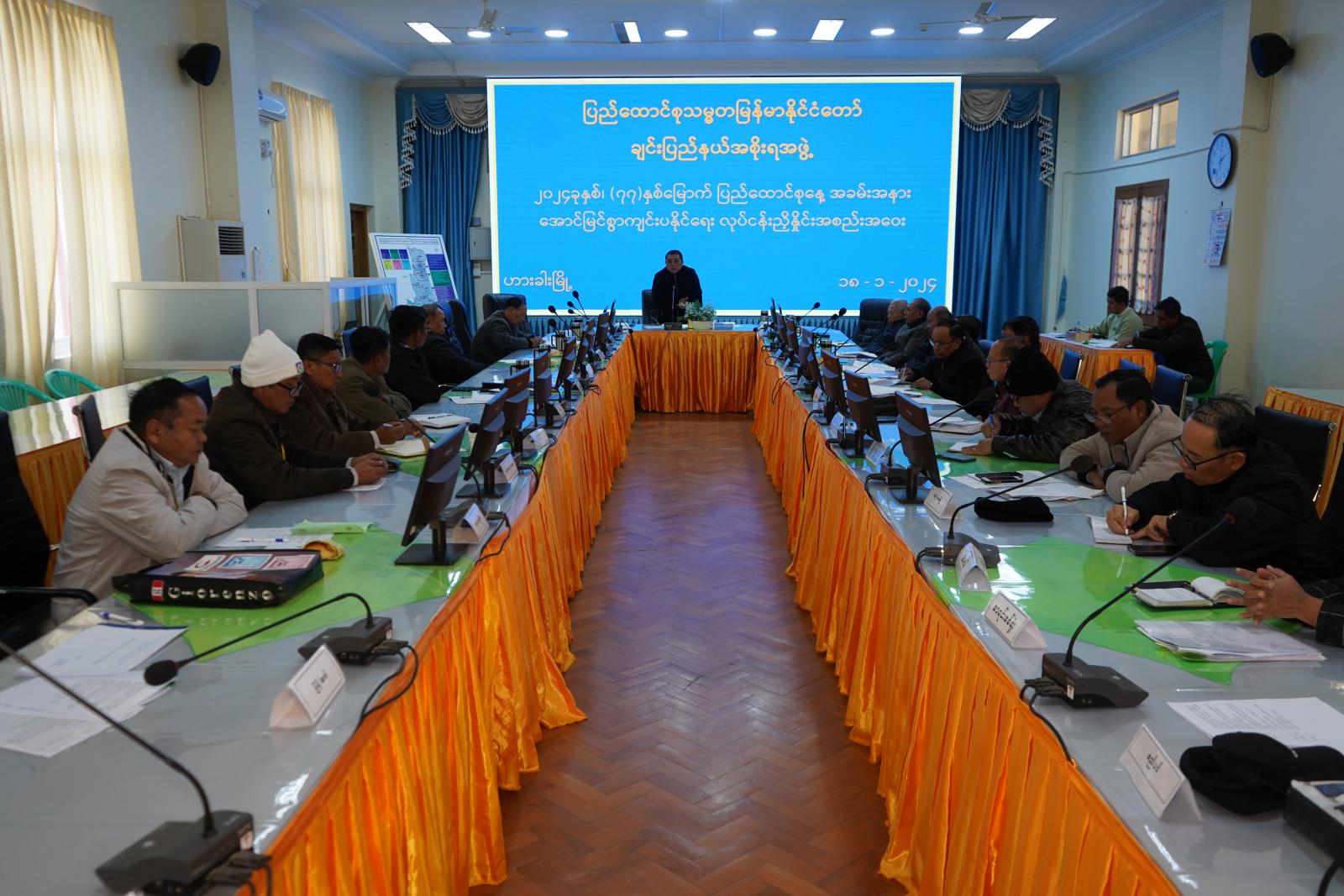 ထို့နောက် (၇၇) နှစ်မြောက် ပြည်ထောင်စုနေ့အောင်မြင်စွာကျင်းပနိုင်ရေး ဆပ်ကော်မတီအသီးသီးမှ ဥက္ကဋ္ဌနှင့်အတွင်းရေးမှူးများက ဆောင်ရွက်ပြီး၊ ဆောင်ရွက်ဆဲ၊ ခန့်မှန်းကုန်ကျစရိတ်နှင့် ညှိနှိုင်းပေါင်းစပ်ဆောင်ရွက်ပေးရန် လိုအပ်သည့်အချက်များကို Power Point ဖြင့် ရှင်းလင်းတင်ပြကြသည်။