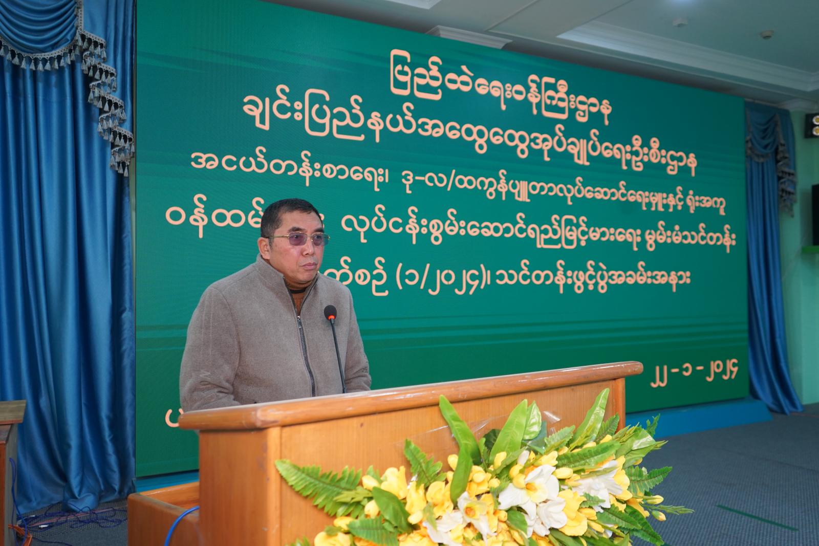 သင်တန်းဖွင့်ပွဲအခမ်းအနားတွင် ပြည်နယ်ဝန်ကြီးချုပ် ဒေါက်တာ ဝုန်ဆွန်းထန်က အထွေထွေအုပ်ချုပ်ရေးဦးစီးဌာနသည် နိုင်ငံတော် အုပ်ချုပ်ရေးယန္တရားကို ဟန်ချက်ညီညီ လည်ပတ်အောင် ဆောင်ရွက်သည့် ဌာနဖြစ်သလို ရပ်ကွက်/ကျေးရွာအုပ်စုအထိ အုပ်ချုပ်ရေးယန္တရား ချောမွေ့စွာ လည်ပတ်နိုင်ရေးအတွက် အကောင်အထည်ဖော်ဆောင်ရွက်နေသည့် ဌာနဖြစ်ပါကြောင်း၊ ထို့အပြင် နိုင်ငံတော်စီမံအုပ်ချုပ်ရေး ကောင်စီ၏ ရှေ့ဆက်သွားရမည့်မူဝါဒများကို အကောင်အထည်ဖော် ဆောင်ရွက်ရာတွင်လည်း ကြီးလေးသည့်တာဝန်များကို ထမ်းဆောင်ရသည့် ဌာနဖြစ်ပါကြောင်း၊ သို့ဖြစ်ရာ ဝန်ထမ်းများအားလုံးက ဥပဒေ၊ နည်းဥပဒေ၊ လုပ်ထုံးလုပ်နည်း၊ အမိန့်၊ ညွှန်ကြားချက်များကို ကျေညက်မှသာ ရုံးလုပ်ငန်းများ မြန်ဆန်သွက်လက်မည်ဖြစ်ပါကြောင်း၊ ထို့ကြောင့် ဝန်ထမ်း များ၏ ကိုယ်ရည်ကိုယ်သွေး၊ လုပ်ငန်းကျွမ်းကျင်မှု၊ နိုင်ငံတော်အပေါ် သစ္စာရှိမှု၊ တာဝန်ယူ၊ တာဝန်ခံစိတ်ရှိမှုနှင့် မိမိတို့ဌာနအပေါ်ဂုဏ်ယူပြီး လုပ်ငန်းတာဝန်အပေါ် တန်ဖိုးထားတတ်မှု စသည့် အရည် အသွေးကောင်းများ မြှင့်တင်ပေးနိုင်ရေးအတွက် ယခုကဲ့သို့ သင်တန်းဖွင့်လှစ်ပေးခြင်းဖြစ်ကြောင်း၊ သို့ဖြစ်၍ ယနေ့ဖွင့်လှစ်သည့် စွမ်းရည်မြှင့် သင်တန်းတွင် တက်ရောက်လာကြသည့် ဝန်ထမ်းများ အနေဖြင့် သင်တန်းတွင် သင်ကြားပေးသည့် သင်ခန်းစာများကို သေချာလေ့လာမှတ်သား စေလိုကြောင်းနှင့် နောင်တစ်ချိန်တွင် ဌာန၏အကြီးအကဲဖြစ်သော ညွှန်ကြားရေးမှူးချုပ်အဆင့်အထိကို မျှော်မှန်း၍ အပတ်တကုတ်လေ့လာ လိုက်စားပြီး ရိုးရိုးသားသား ကြိုးစားလုပ်ကိုင်ပြုမူနေထိုင်စေလိုကြောင်းဖြင့် အမှာစကားပြောကြား၍ သင်တန်းသား၊ သင်တန်းသူများအား ရင်းရင်းနှီးနှီးနှုတ်ဆက် ကာ အားပေးစကားပြောကြားသည်။