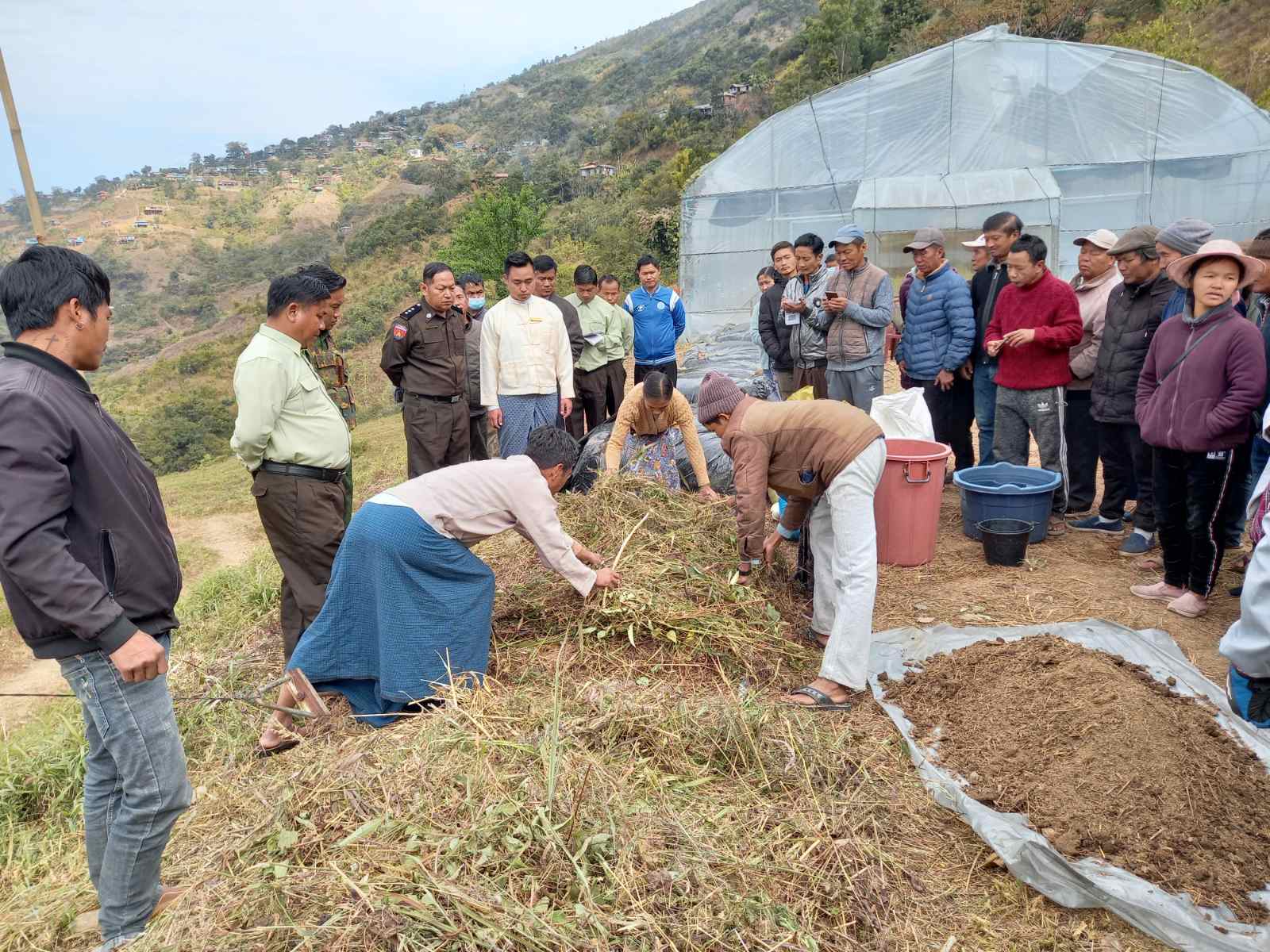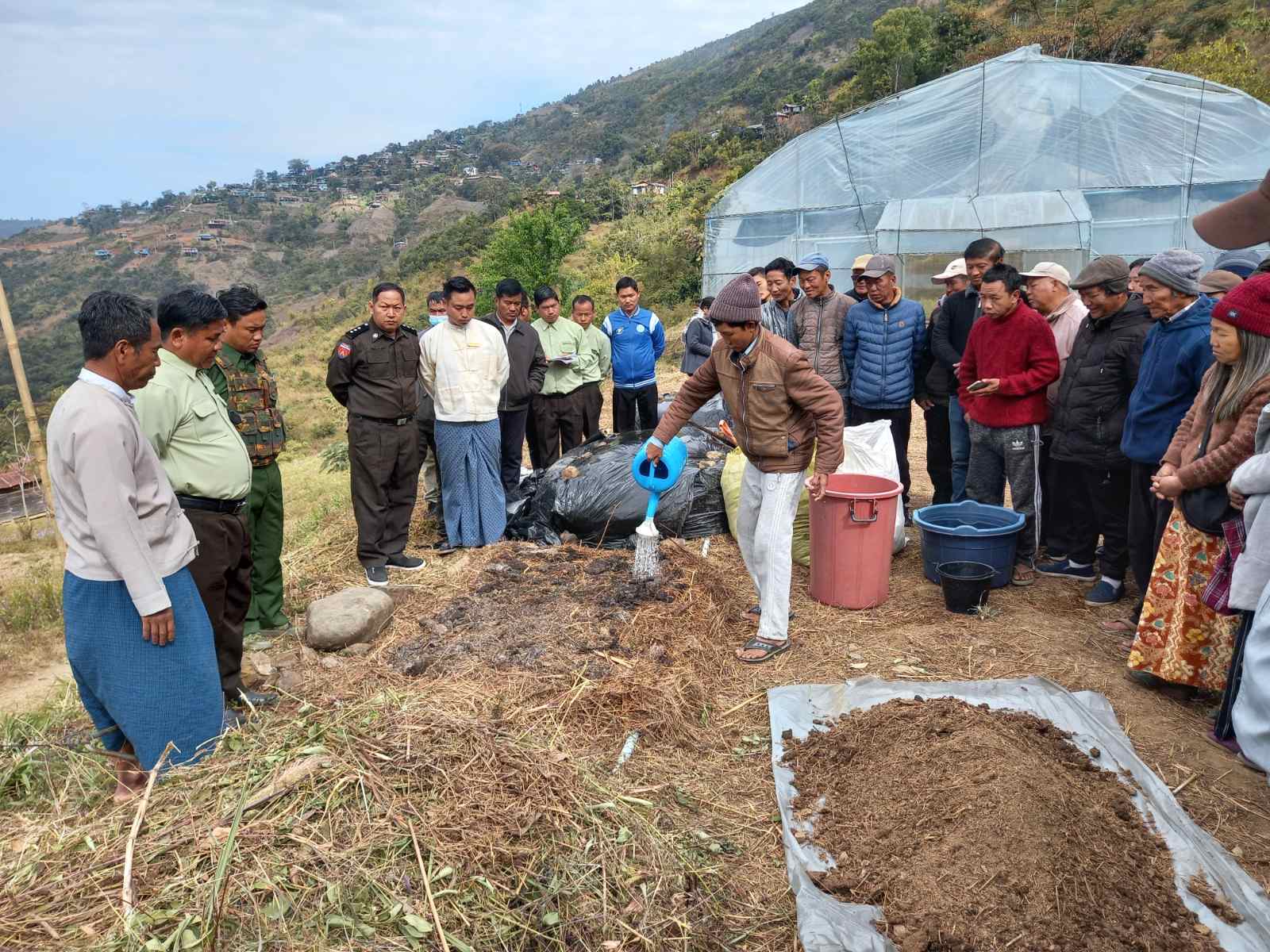 ချင်းပြည်နယ်၊ တွန်းဇံမြို့တွင် နိုင်ငံ့စီးပွားမြှင့်တင်ရေးရန်ပုံငွေမှ အရင်းမပျောက်မတည် ထောက်ပံ့ရန်ပုံငွေ ရယူထားသော စိုက်ပျိုးရေးတောင်သူများအား သဘာဝမြေဆွေးပြု လုပ်နည်းနှင့် ဝဥစိုက်ပျိုးနည်း လက်တွေ့သရုပ်ပြခြင်းကို ခေါလိုင်/ဂိုးဇန်ရပ်ကွက်ရှိ စိုက်ပျိုးရေး ဦးစီးဌာန၊ ဝါနှင့်လျှော်မျှင်ထွက်သီးနှံဌာနခွဲ ခြံဝင်း၌ ဇန်နဝါရီ ၂၄ ရက် နံနက်(၁၀)နာရီ အချိန်ကပြုလုပ်သည်။
