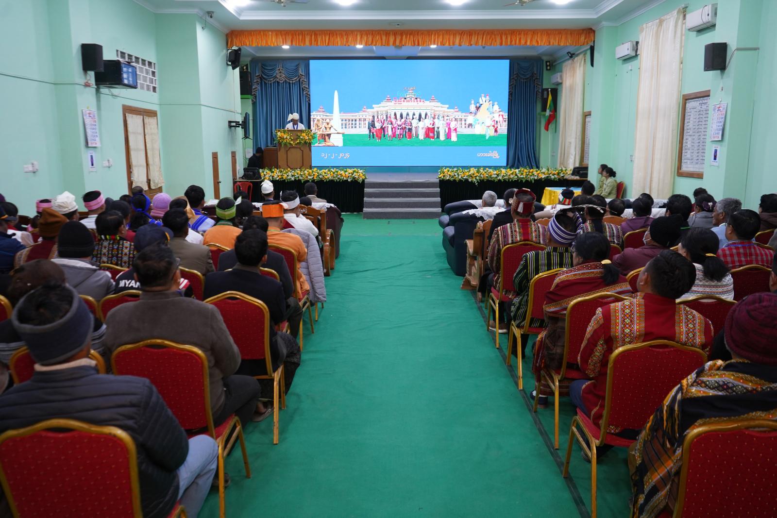 ၂၀၂၄ ခုနှစ်၊ ယမန်နေ့တွင် ကျရောက်သည့် (၇၇)နှစ်မြောက် ပြည်ထောင်စုနေ့ သဝဏ်လွှာဖတ်ကြားခြင်း အခမ်းအနားကို ယမန်နေ့နံနက် (၇)နာရီက ဟားခါးမြို့ ၊ ချင်းပြည်နယ် အထွေထွေအုပ်ချုပ်ရေးဦးစီးဌာ၊ အစည်းအဝေးခန်းမ၌ကျင်းပရာ ချင်းပြည်နယ်ဝန်ကြီးချုပ် ဒေါက်တာဝုန်ဆွန်းထန်၊ ပြည်နယ်တရားလွှတ်တော် တရားသူကြီးချုပ်ဦးနေစိုး ၊ အနောက်မြောက်တိုင်း စစ်ဌာနချုပ်မှ ဗိုလ်မှူးချုပ် နိုင်ဝင်းအောင် ၊ ပြည်နယ်အစိုးရအဖွဲ့ဝင် ဝန်ကြီးများ ၊ ပြည်နယ်ဥပဒေချုပ် ၊ ပြည်နယ်အစိုးရအဖွဲ့ အတွင်းရေးမှူးနှင့် ပြည်နယ်၊ ခရိုင်၊ မြို့နယ် အဆင့်ဌာနဆိုင်ရာ တာဝန်ရှိသူများ၊ အစိုးရမဟုတ်သော အသင်းအဖွဲ့များမှ တာဝန်ရှိသူများနှင့် တိုင်းရင်းသား၊ တိုင်းရင်းသူများ တက်ရောက်ကြသည်။