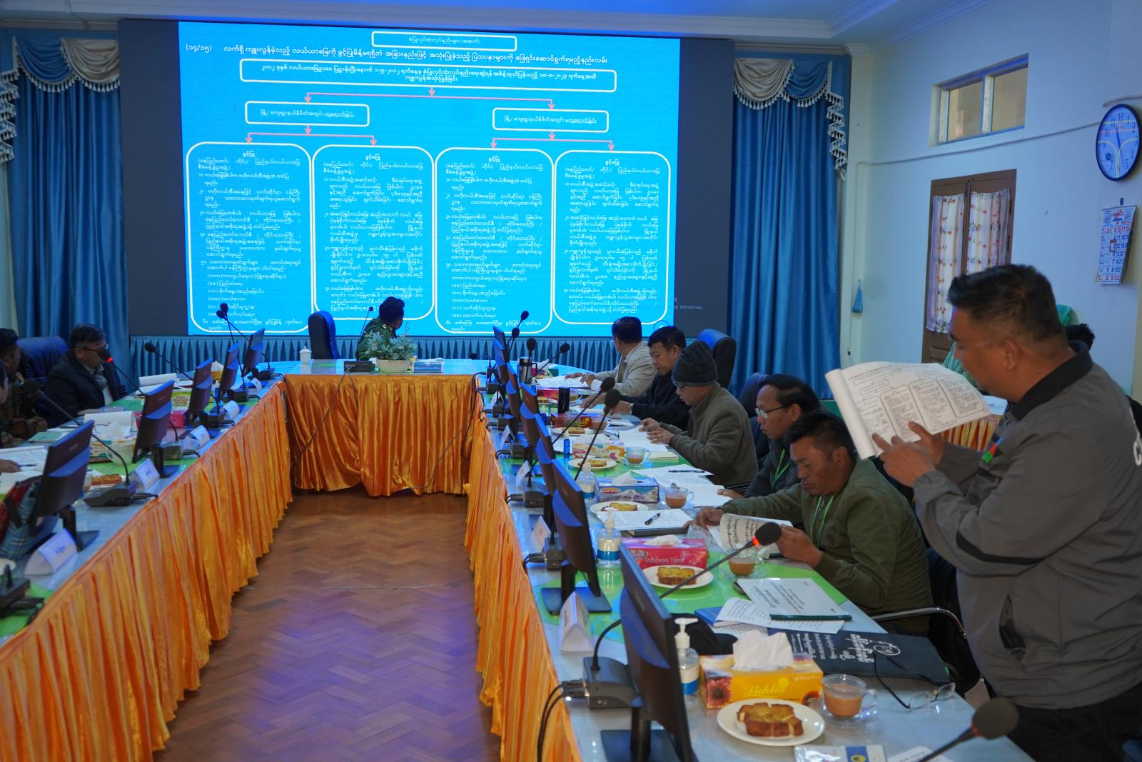 ထို့နောက် လယ်ယာမြေတွင် ခွင့်ပြုမိန်မရရှိဘဲ ကျူးလွန်ဆောင်ရွက်မှု အခြေအနေကို ခွင့်ပြု ရန်သင့်မသင့် စိစစ်ခွဲခြားရန်အတွက် လုပ်ငန်းကော်မတီ၊ တွဲဖက်အတွင်းရေးမှူး (ကိုယ်စား) ပြည်နယ် လယ်ယာမြေစီမံခန့်ခွဲရေးနှင့် စာရင်းအင်းဦးစီးဌာန ၊ ဒုတိယညွှန်ကြားရေးမှူးက လယ်ယာမြေကို ခွင့်ပြုမိန့်မရှိဘဲ အခြားနည်းဖြင့်အသုံးပြုခြင်းများကို ဖြေရှင်းနိုင်ရန်နှင့် နောင်ထပ်မံမဖြစ်စေရေး အတွက် ထိန်းချုပ်နိုင်ရန် ဆောင်ရွက်မည့် စံပြုလုပ်ထုံးလုပ်နည်းများကို (Power Point) ဖြင့် အသေး စိတ်ရှင်းလင်းတင်ပြသည်။