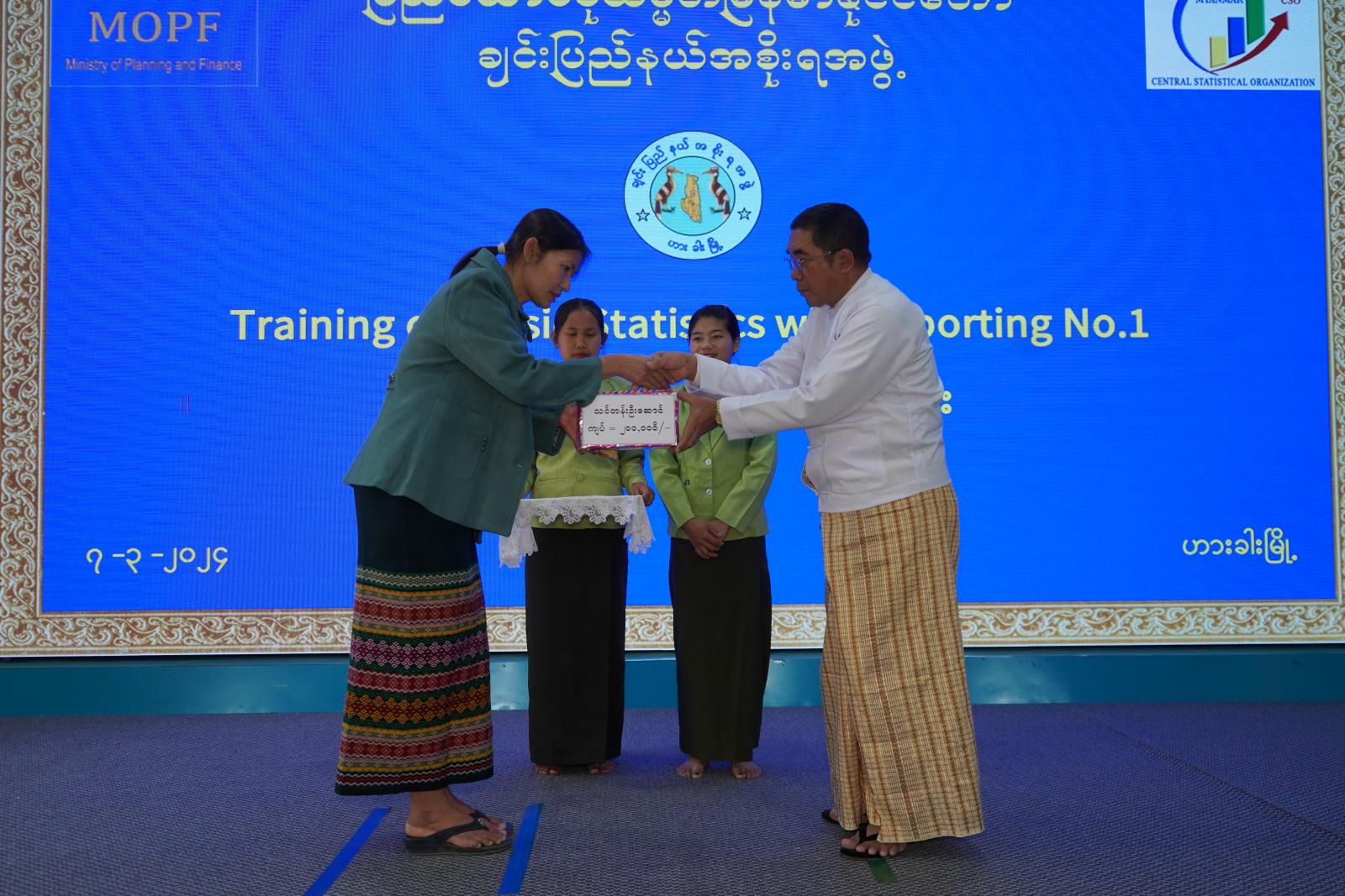 ထို့နောက် သင်တန်းနည်းပြ၊ ဗဟိုစာရင်းအင်းဦးစီးဌာနမှ ဒုတိယညွှန်ကြားရေးမှူး ဒေါ်ချိုချိုဝင်းက သင်တန်းဖွင့်လှစ်ရခြင်းနှင့် ပတ်သက်၍ Power Point ဖြင့် ရှင်းလင်းတင်ပြပြီး သင်တန်းနည်းပြ၊ သင်တန်းလက်ထောက်နည်းပြနှင့် သင်တန်းဦးဆောင်သူများအား ပြည်နယ်ဝန်ကြီးချုပ်ကလည်းကောင်း၊ သင်တန်းတွင် ပထမ၊ ဒုတိယနှင့် တတိယဆုရရှိသူများအား ပြည်နယ်တရား လွှတ်တော်တရားသူကြီးချုပ် ဦးနေစိုးကလည်းကောင်း၊ သင်တန်းဆင်းလက်မှတ်များကို ပြည်နယ်စီးပွားရေးရာဝန်ကြီး ဦးဟန်ကျင့်ဇမ်းကလည်းကောင်း ပေးအပ်ပြီး သင်တန်းသား၊ သင်တန်းသူများ ကိုယ်စားသင်တန်းသူတစ်ဦးက ကျေးဇူးတင်စကား ပြောကြားကာ ပြည်နယ်ဝန်ကြီးချုပ်က အခမ်းအနား တက်ရောက်သူများအား ရင်းရင်းနှီးနှီးနှုတ်ဆက်၍ အားပေးစကားပြောကြားခဲ့ကြောင်း သိရ သည်။