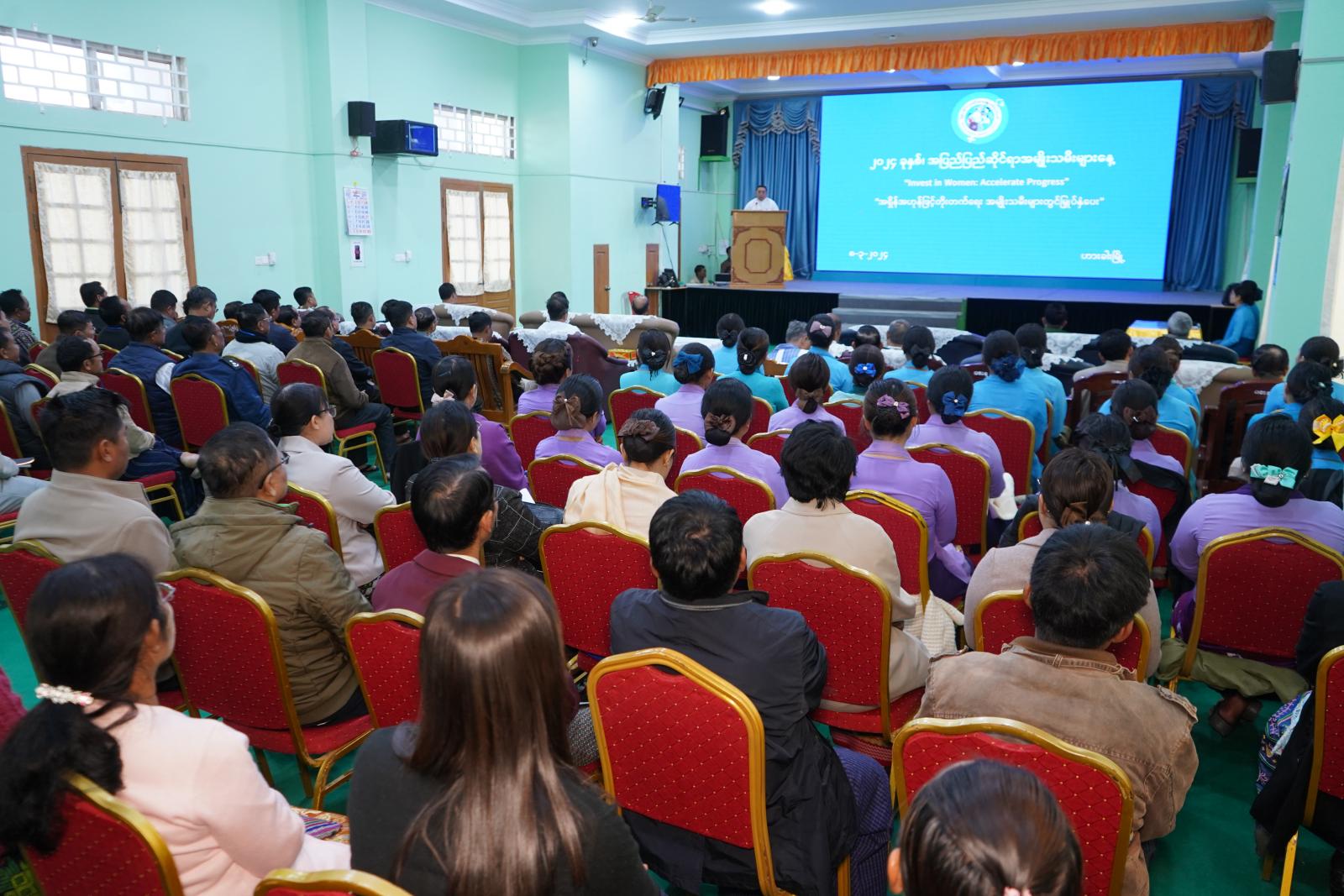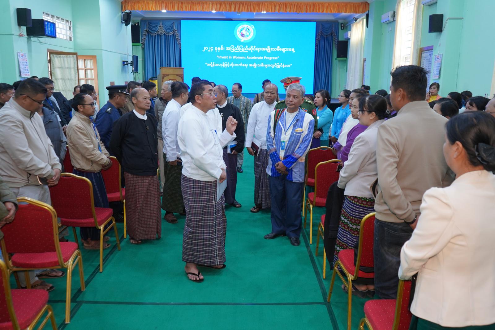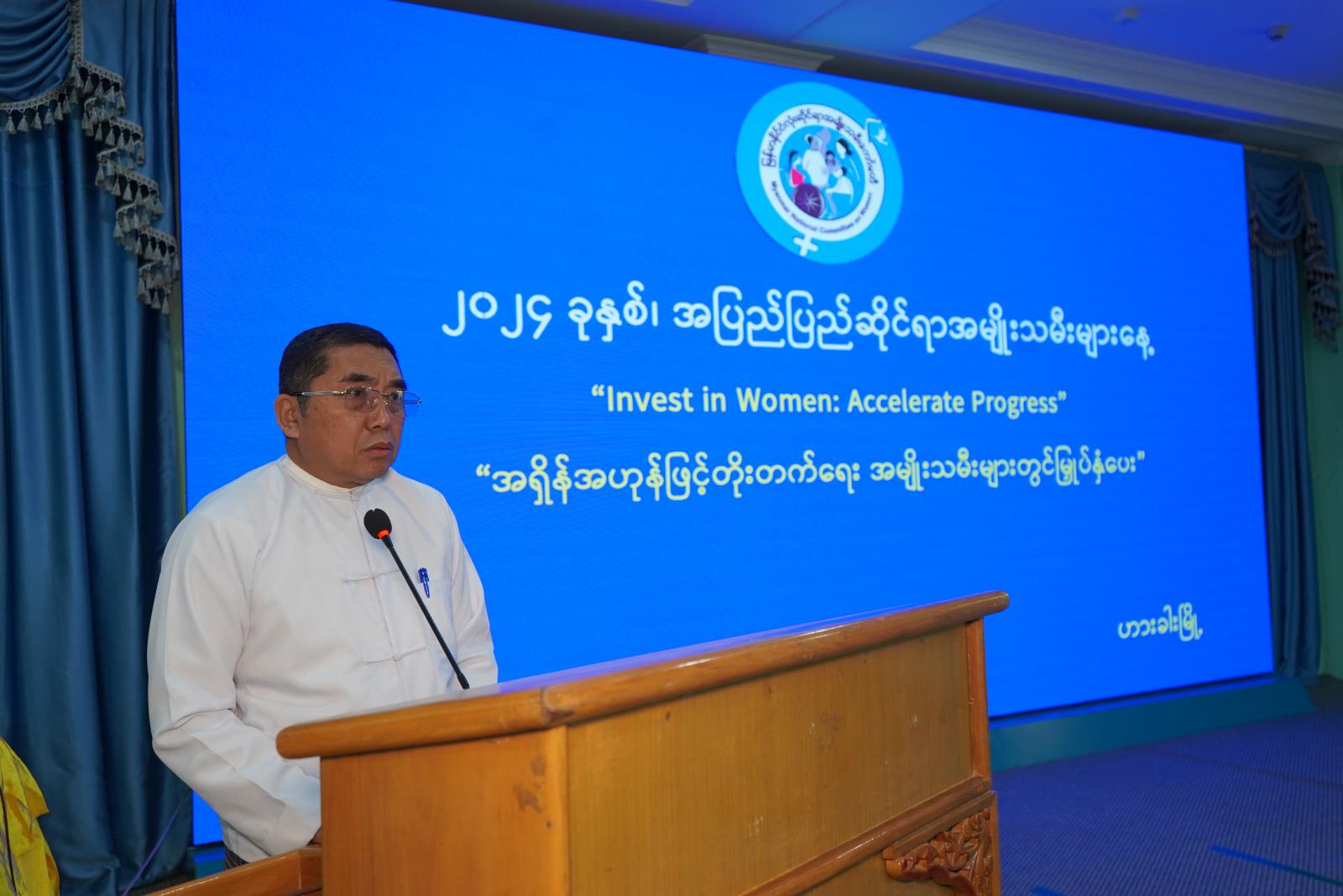 အခမ်းအနားတွင် ပြည်နယ်ဝန်ကြီးချုပ် ဒေါက်တာဝုန်ဆွန်းထန်က မြန်မာနိုင်ငံသည် စတုတ္ထအကြိမ်မြောက် ကမ္ဘာ့အမျိုးသမီးညီလာခံ (ဘေဂျင်း၊ ၁၉၉၅) ကို အခြေခံ၌ အမျိုးသမီးများအား နည်းမျိုးစုံဖြင့် ခွဲခြားဆက်ဆံမှုပပျောက်ရေးဆိုင်ရာ ကုလသမဂ္ဂသဘောတူစာချုပ် ( Convention on the Elimination of all Forms of Discrimination Against Women – CEDAW ) ကို ၁၉၉၇ ခုနှစ် တွင် ပါဝင်လက်မှတ်ရေးထိုးခဲ့ပြီး အမျိုးသမီးများ၏ အခွင့်အရေးများ အပြည့်အဝေရရှိရေး၊ ကျား/မ ရေးရာ တန်းတူညီမျှရေးနှင့် အမျိုးသမီးများအပေါ် အကြမ်းဖက်မှုမျိုးစုံမှ ကာကွယ်စောင့်ရှောက်ရေး၊ မြန်မာအမျိုးသမီးများ၏ စွမ်းဆောင်ရည်မြင့်မားရေးနှင့် ဖွံ့ဖြိုးတိုးတက်ရေးတို့အတွက် မူဝါဒများ၊ လုပ်ငန်းစဉ်များကို ချမှတ်ဆောင်ရွက်ခဲ့ပါကြောင်း၊ ယခုလက်ရှိတွင် အမျိုးသမီးများဖွံ့ဖြိုးတိုးတက် ရေးဆိုင်ရာ နိုင်ငံတော်အဆင့်မဟာဗျူဟာစီမံကိန်း (NSPAW) နက်စ်ပေါ (၂၀၂၃−၂၀၃၂) မူကြမ်းကို ရေးဆွဲထားပြီး လုပ်ငန်းစီမံချက်များကို ဆက်လက်အကောင်အထည်ဖော် ဆောင်ရွက်လျက်ရှိပါကြောင်း၊ ၂၀၂၄ ခုနှစ်က ထုတ်ပြန်ခဲ့သည့် မြန်မာနိုင်ငံလူမှုကာကွယ်စောင့်ရှောက်ရေး အမျိုးသားအဆင့် မဟာဗျူဟာစီမံချက်တွင်ပါရှိသော လုပ်ငန်စဉ် (၈) ရပ်တွင် ကိုယ်ဝန်ဆောင်မိခင်များအား စောင့်ရှောက်ရေးနှင့် အထောက်အပံ့ပေးရေးအစီအစဉ်ကို နံပါတ် (၁) လုပ်ငန်းစဉ်အဖြစ် ဖော်ပြထားပါကြောင်း၊ အမျိုးသမီးများအတွက် အာခခံချက်ရှိသည့် တန်းတူအခွင့်အရေးများ သေချစွာရရှိရန် ဆောင်ရွက်ဖို့ အခြားကမ္ဘာ့နိုင်ငံများကဲ့သို့ပင် မြန်မာနိုင်ငံတွင်လည်း တာဝန်ရှိကြောင်း၊ ၂၀၂၄ ခုနှစ်၊ အပြည်ပြည်ဆိုင်ရာအမျိုးသမီးများနေ့၏ ဆောင်ပုဒ်မှာ “အရှိန်အဟုန်ဖြင့်တိုးတက်ရေး အမျိုးသမီးများတွင် မြှုပ်နှံပေး” ဖြစ်ကြောင်းနှင့် အမျိုးသမီးများ၏ဘဝ လုံခြုံခြင်း၊ စွမ်းဆောင်ရည်နှင့် ပညာရည်မြင့်မားခြင်းတို့သည် နိုင်ငံ၏လူမှုစီးပွားဘဝ ဖွံ့ဖြိုးတိုးတက်ပြီး ငြိမ်းချမ်းသာယာသော လူ့ဘောင်အဖွဲ့အစည်းကို တည်ဆောက်နိုင်ကြောင်းဖြင့် အမှာစကား ပြောကြားသည်။