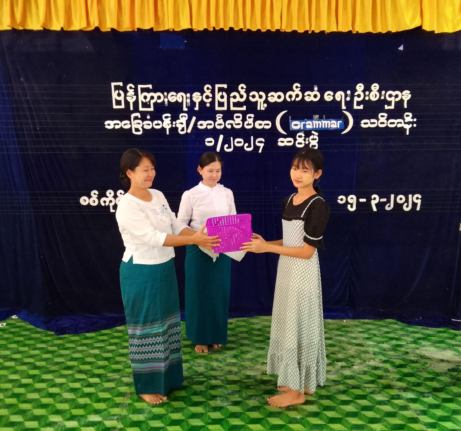 ထို့နောက် ပြန်ကြားရေးနှင့်ပြည်သူဆက်ဆံရေးဦးစီးဌာန၊ ခရိုင်ဦးစီးမှူး ဒေါ်နေမျိုးပိုင်က သင်တန်နည်းပြဆရာအား ဂါရဝပြုလက်ဆောင်ပေးအပ်ခဲ့ပြီး ပုံတူပန်းချီဆွဲပြိုင်ပွဲတွင် ဆုရရှိကြသည့် ကလေးများအာ ဆုများအသီးသီး ပေးအပ်ချီးမြင့်ခဲ့ကြောင်း သိရှိရသည်။