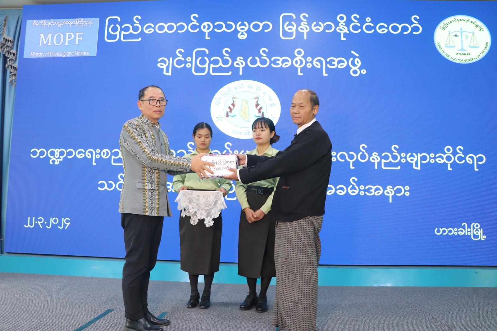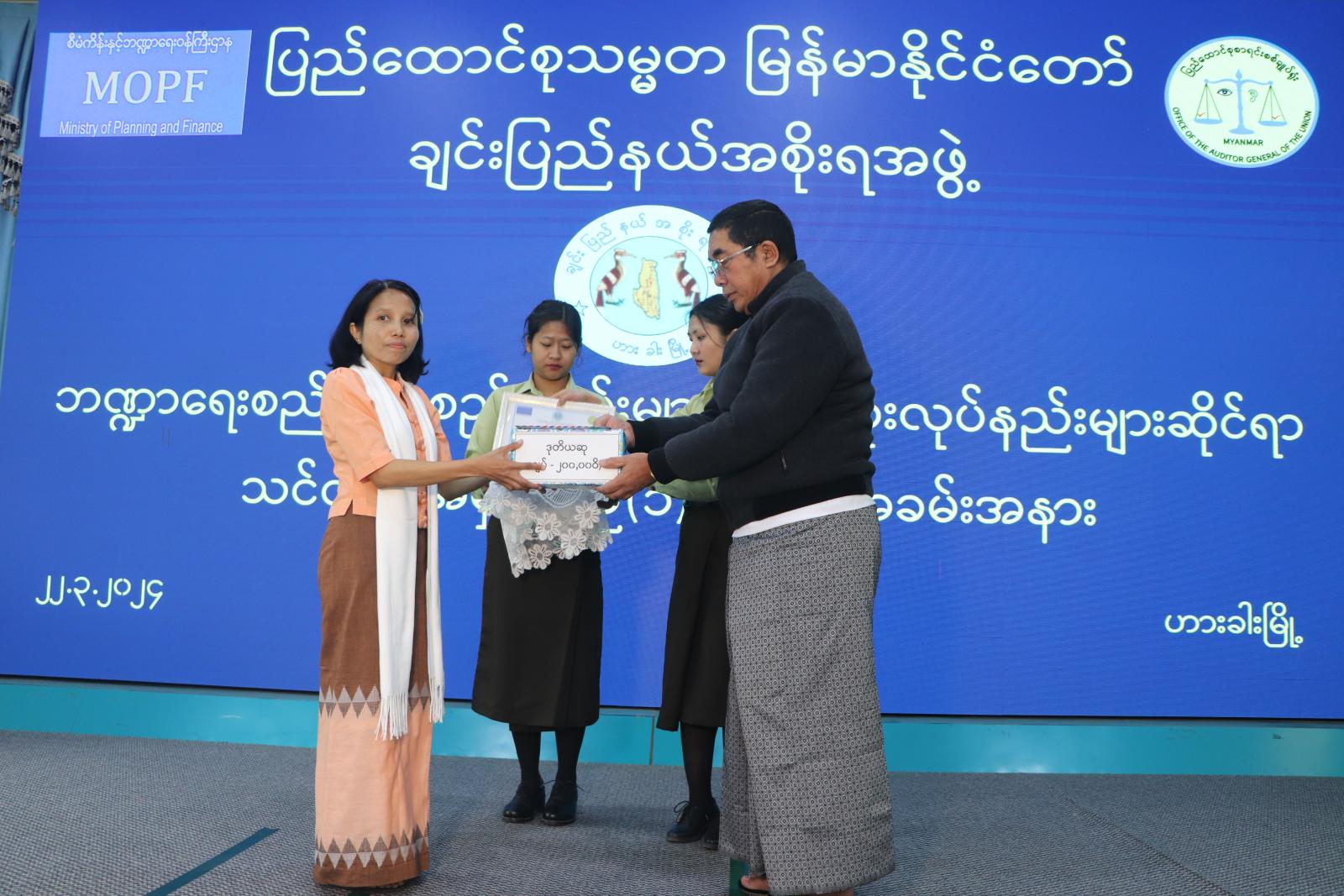ထို့နောက် သင်တန်းနည်းပြများကိုယ်စား ပြည်နယ်ရသုံးမှန်းခြေငွေစာရင်းဦးစီးဌာနမှ ညွှန်ကြားရေးမှူး ဦးကျော်ဇင်ဦးက သင်တန်းပို့ချခြင်းနှင့်ပတ်သက်၍ ရှင်းလင်းတင်ပြပြီး သင်တန်းတွင် ပထမ၊ ဒုတိယ၊ တတိယရရှိသူများနှင့် သင်တန်းသား၊ သင်တန်းသူများကိုယ်စား လှယ်တစ်ဦးအား ပြည်နယ်ဝန်ကြီးချုပ် ဒေါက်တာဝုန်ဆွန်းထန်က လည်းကောင်း၊ သင်တန်းနည်းပြများဖြစ်ကြသည့် ပြည်နယ်စီမံကိန်းဦးစီးဌာနမှ ညွှန်ကြားရေးမှူး၊ ဦးသန်းအောင်၊ ပြည်နယ်စာရင်းစစ်ရုံးမှ ညွှန်ကြားရေးမှူး ဒေါ်ဥမ္မာအောင်၊ ပြည်နယ်ရသုံးမှန်းခြေ ငွေစာရင်းဦးစီးဌာနမှ ညွှန်ကြားရေးမှူး ဦးကျော်ဇင်ဦးနှင့် ခရိုင်စာရင်းစစ်ရုံးမှ လက်ထောက်ညွှန်ကြားရေးမှူး ဦးဇော်မင်းတို့အား ပြည်နယ် တရားလွှတ်တော်တရားသူကြီးချုပ် ဦးနေစိုးကလည်းကောင်း၊ သင်တန်းအုပ်ချုပ်သူနှင့် ကြီးကြပ်သူများအား ပြည်နယ်စီးပွားရေးရာဝန်ကြီး ဦးဟန်ကျင့်ဇမ်းက လည်းကောင်း ဂုဏ်ပြုဆုငွေနှင့် သင်တန်း ဆင်းလက်မှတ်များ ပေးအပ်ချီးမြှင့်ကြသည်။
