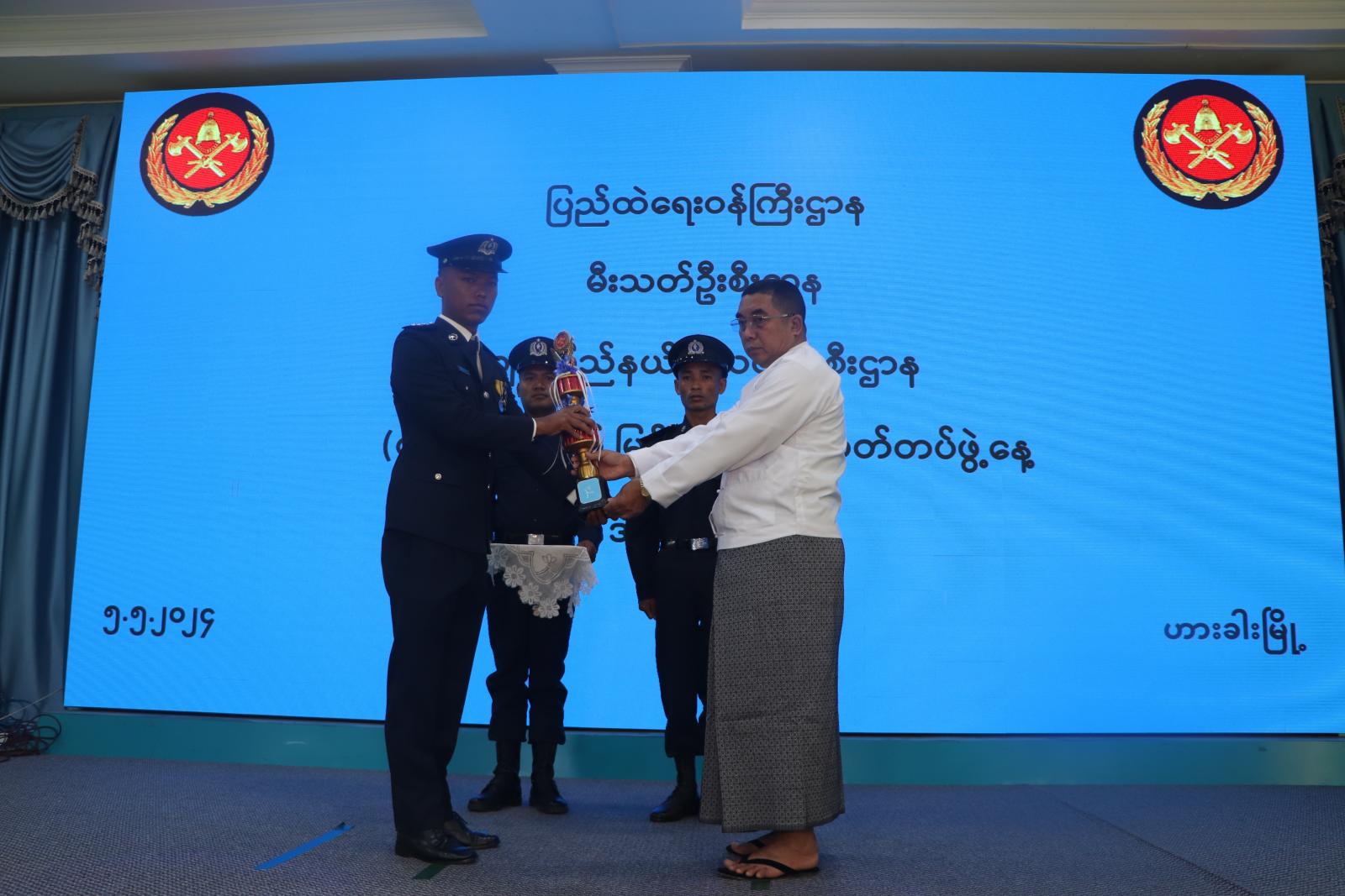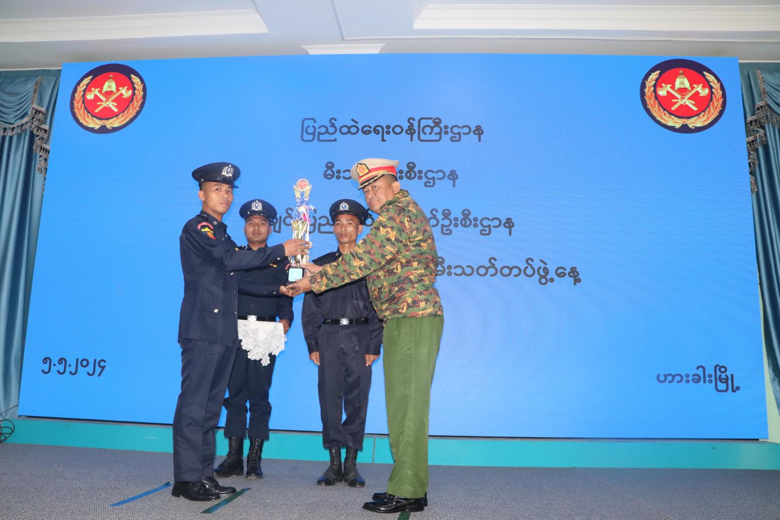ထို့နောက် ပြည်နယ်အဆင့် မီးသတ်စခန်း စံပြပထမဆုရရှိသည့် ဖလမ်းမြို့နယ်မီးသတ်ဦးစီးမှူးရုံးအား ပြည်နယ်ဝန်ကြီးချုပ် ဒေါက်တာဝုန်ဆွန်းထန်ကလည်းကောင်း ၊ ပြည်နယ်အဆင့် မီးသတ်စခန်းစံပြဒုတိယဆုရရှိသည့် တီးတိန်မြို့နယ်မီးသတ်ဦးစီးမှူးရုံးအား ပြည်နယ်တရားလွှတ် တော်တရားသူကြီးချုပ် ဦးနေစိုးကလည်းကောင်း ၊ ပြည်နယ်အဆင့် မီးသတ်စခန်း စံပြတတိယဆုရရှိသည့် တွန်းဇံမြို့နယ်မီးသတ်ဦးစီးမှူးရုံးအား ပြည်နယ်လုံခြုံရေးနှင့်နယ်စပ်ရေးရာဝန်ကြီး ဗိုလ်မှူးကြီးသိန်းထွန်းအောင်ကလည်းကောင်း ဆုများပေးအပ်ချီးမြှင့်ကြသည်။