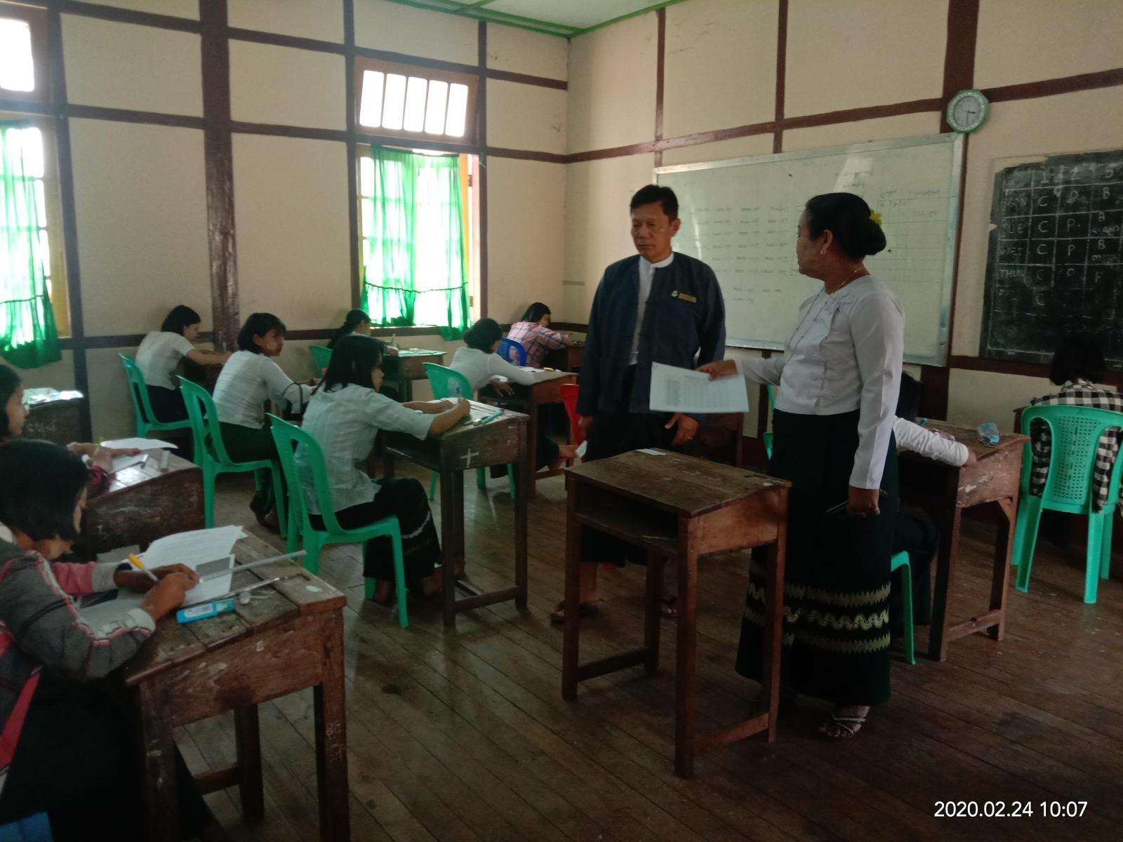ယင်းသို့ အတန်းတင်စာမေးပွဲ ဖြေဆိုရာသို့ သုံးခွမြို့နယ် ပညာရေးမှူး ဒေါ်သန်းသန်းမြင့်နှင့် တာဝန်ရှိသူများက ကွင်းဆင်းကြည့်ရှုစစ်ဆေးသည်။