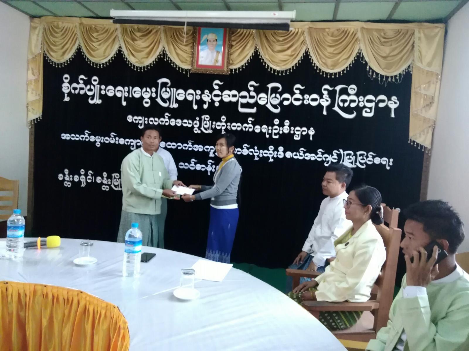 ထို့နောက် တစ်လုံးထိုးဒီဇယ်အင်ဂျင်ပြုပြင်နည်း အထောက်အကူပစ္စည်းများ ထောက်ပံ့မှုကို မြို့နယ်စီမံကိန်းဦးစီးမှူး ဒေါ်အေးသင်းကပေးအပ်ကာ သင်တန်းဆင်းလက်မှတ်ကို ဆရာဦးသန့်ဇင်ဝင်းက ပေးအပ်ချီးမြှင့်ပေးခဲ့ကြောင်း သိရသည်။
