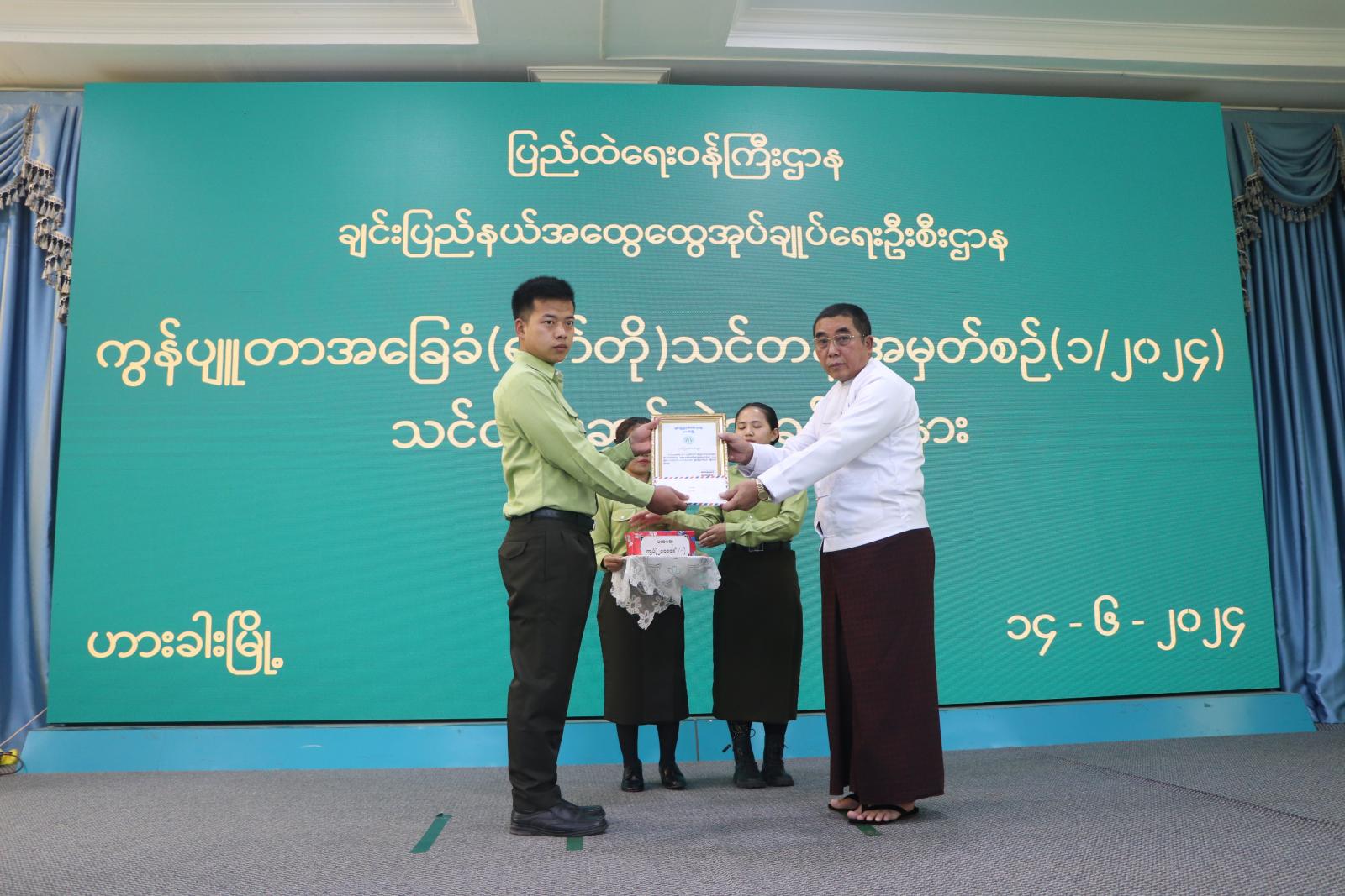 ထို့နောက် သင်တန်းနည်းပြ လက်ထောက်ညွှန်ကြားမှူး ဦးသိန်းကိုက သင်တန်းတက်ရောက် ခဲ့ကြသည့် သင်တန်းသား၊ သင်တန်းသူများ၏ အခြေအနေအား ရှင်းလင်းတင်ပြပြီး မွမ်းမံသင်တန်းတွင် ပထမ၊ ဒုတိယနှင့် တတိယရရှိသူများကို ပြည်နယ်ဝန်ကြီးချုပ်၊ ပြည်နယ်တရားလွှတ်တော် တရားသူကြီးချုပ် ဦးနေစိုးနှင့် ပြည်နယ်စီးပွားရေးရာဝန်ကြီး ဦးဟန်ကျင့်ဇမ်းတို့က လည်းကောင်း၊ အခြေခံသင်တန်းတွင် ပထမ၊ ဒုတိယနှင့် တတိယရရှိသူများကို ပြည်နယ်သယံဇာတရေးရာဝန်ကြီး ဦးကျော်ငြိမ်း ၊ ပြည်နယ်လူမှုရေးရာဝန်ကြီး ဦးဝင်းဇော်ဦးနှင့် ပြည်နယ်လမ်းပန်းဆက်သွယ်ရေး ဝန်ကြီး ဦးနေလင်းအောင်တို့က လည်းကောင်း၊ သင်တန်းနည်းပြ လက်ထောက်ညွှန်ကြားရေးမှူး ဦးသိန်းကို ကို ချင်းပြည်နယ်အုပ်ချုပ်ရေးမှူး ဦးအောင်ချိုကလည်းကောင်း၊ သင်တန်းဆင်းလက်မှတ်များကို ညွှန်ကြားရေးမှူး ဦးထွန်းသိန်းနှင့် ဒုတိယညွှန်ကြားရေးမှူး ဦးသီဟံစိုးတို့ကလည်းကောင်း ဂုဏ်ပြုလွှာနှင့် ဂုဏ်ပြုဆုငွေများ ပေးအပ်ချီးမြှင့်ကြသည်။