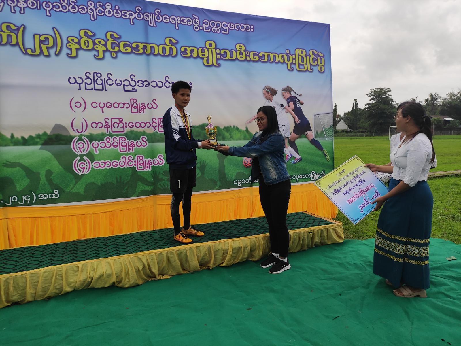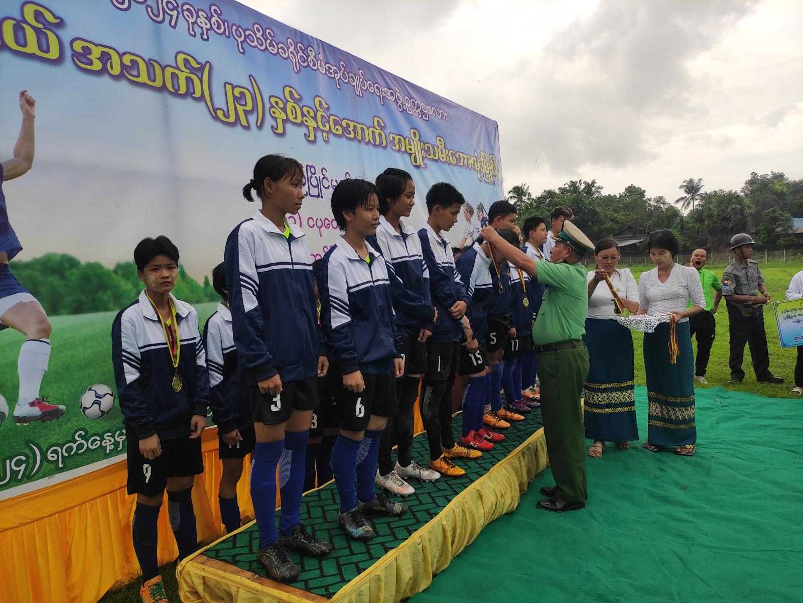 ဆက်လက်၍ ဆုချီးမြှင့်ပွဲအခမ်းအနားကိုပြုလုပ်ရာ ဆုရရှိသည့်အသင်းများမှ အားကစားသမားများက နေရာယူကြပြီးနောက် ဒုတိယဆုရှိသော ငပုတောမြို့နယ်အသင်းအား တစ်ဦးချင်းဆုဖလားနှင့် ငွေသားဆုများကို ခရိုင်အတွင်းရေးမှူး ဒုတိယရဲမှူးကြီး တင်ထွန်းအောင်ကလည်းကောင်း၊ ပထမဆုရရှိသော ကန်ကြီးထောင့်မြို့နယ်အား တစ်ဦးချင်းဆုနှင့် ငွေသားဆုများကို ခရိုင်အဖွဲ့ဝင် (၁) ဒုတိယဗိုလ်မှူးကြီး စောအောင်သိုက်ကလည်းကောင်း ဂိုးသမားအကောင်းဆုံးဆု၊ နောက်တန်းကစားသမား အကောင်းဆုကို ခရိုင်စီမံအဖွဲ့ဝင် (၃) ကလည်ကောင်း၊ အလယ်တန်းအကောင်းဆုံးဆု၊ ရှေ့တန်းအကောင်းဆုံးဆု၊ အကောင်းဆုံး ကစားသမားဆုရှိသူအား တစ်ဦးချင်းဆုဖလားနှင့် ငွေသားဆုကိုခရိုင်အဖွဲ့ဝင် (၂) ကလည်းကောင်း၊ တစ်ဦးချင်းဆုတံဆိပ်များနှင့် ငွေသားဆုတံဆိပ်များ ချီးမြှင့်ပေးအပ်ချီးမြှင့်ခဲ့ပြီးနောက် ပထမဆုရရှိသည့် ကန်ကြီးထောင့်မြို့နယ် ဘောလုံးဘောလုံးအသင်းအား ခရိုင်စီမံအုပ်ချူပ်ရေးအဖွဲ့ဥက္ကဋ္ဌက တစ်ဦးချင်းဆုတံဆိပ်များ၊ ငွေသားဆုနှင့် တံခွန်စိုက်ဆုဖလားကို ပေးအပ်ချီးမြှင့်ခဲ့ပြီး စုပေါင်းမှတ်တမ်းတင် ဓာတ်ပုံရိုက်ကူးခဲ့ကြသည်။