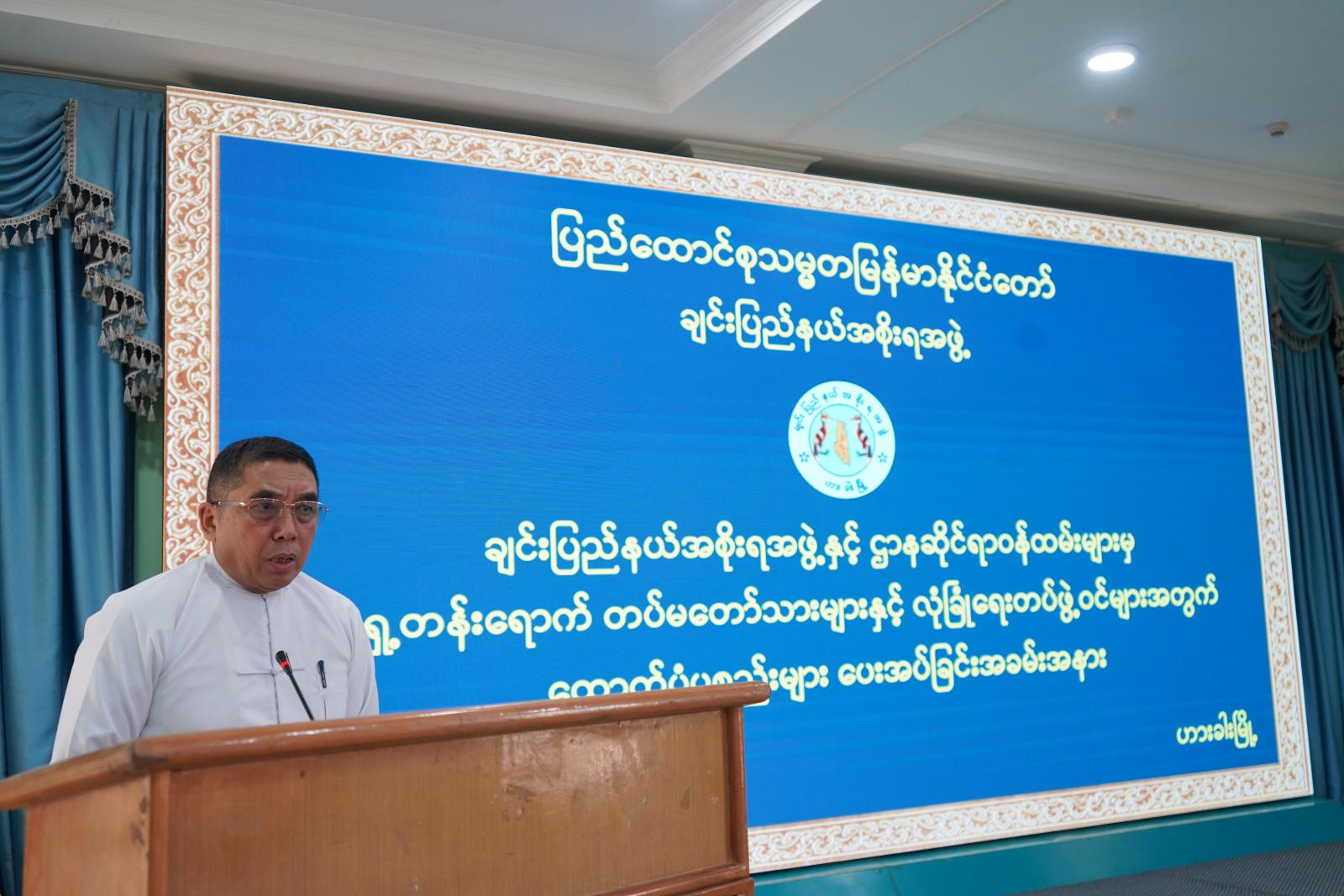 ဦးစွာ ချင်းပြည်နယ်ဝန်ကြီးချုပ် ဒေါက်တာဝုန်ဆွန်းထန်က ချင်းပြည်နယ်အစိုးရအဖွဲ့၊ ဌာနဆိုင်ရာဝန်ထမ်းများနှင့် ဒေသခံပြည်သူများ လုံခြုံအေးချမ်းစွာ အလုပ်လုပ်ကိုင်နိုင်ရေးနှင့် တရားဥပဒေစိုးမိုးရေးအတွက် ဆောင်ရွက်ပေးနေကြသော တပ်မတော်သားများနှင့် လုံခြုံရေးတပ်ဖွဲ့ဝင်များ၏ သက်သာချောင်ချိရေးအတွက် ချင်းပြည်နယ်အစိုးရအဖွဲ့မှ အခါအားလျော်စွာ ထောက်ပံ့ပေးလျက်ရှိပါကြောင်း၊ ယနေ့ကျင်းပသည့် ထောက်ပံ့ပေးအပ်သည့်အခမ်းအနားတွင် ချင်းပြည်နယ်အစိုးရအဖွဲ့ သာမကဘဲ ဌာနဆိုင်ရာဝန်ထမ်းများကပါ ပူးပေါင်းပါဝင်ထောက်ပံ့လျက်ရှိကြောင်း၊ ဤကဲ့သို့ တစ်ယောက်နှင့်တစ်ယောက် ထောက်ပံ့ကူညီခြင်းသည် အကျိုးသက်ရောက်မှု ကြီးမားပါကြောင်းနှင့် ချင်းပြည်နယ်အစိုးရအဖွဲ့အနေဖြင့် လုံခြုံရေးနှင့် တရားဥပဒေစိုးမိုးရေးအတွက် အသက်ကိုပဓာနမထားဘဲ ဆောင်ရွက်နေကြသည့် ရှေ့တန်းရောက်တပ်မတော်သားများနှင့် လုံခြုံရေးတပ်ဖွဲ့ဝင်များကို နောင်တွင်လည်း ဆက်လက်ထောက်ပံ့ပေးသွားမည်ဖြစ်ကြောင်း အမှာစကားပြောကြားသည်။