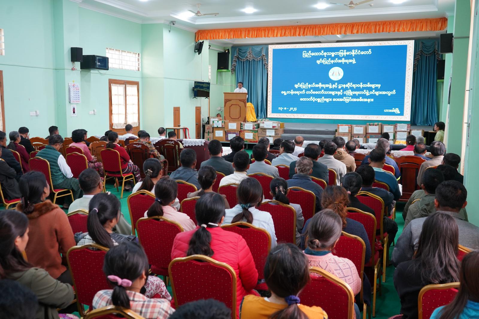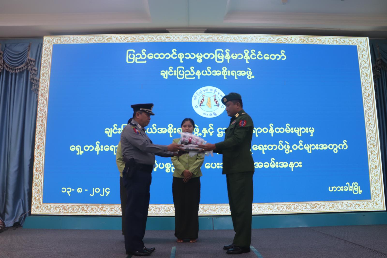 ထို့နောက် ပြည်နယ်ဝန်ကြီးချုပ်က ရှေ့တန်းရောက် တပ်မတော်သားများအတွက် အခြေခံစားသောက်ကုန်များနှင့် ထောက်ပံ့ပစ္စည်းပေးအပ်ရာ ရှေ့တန်းရောက် တပ်မတော်သားများကိုယ်စား အမှတ် (၂၆၆) ခြေလျင်တပ်ရင်း ၊ တပ်ရင်းမှူးကလည်းကောင်း၊ ပြည်နယ်လုံခြုံရေးနှင့်နယ်စပ်ရေးရာဝန်ကြီး ဗိုလ်မှူးကြီးသိန်းထွန်းအောင်က ရှေ့တန်းရောက် လုံခြုံရေးတပ်ဖွဲ့ဝင်များအတွက် အခြေခံ စားသောက်ကုန်များနှင့် ထောက်ပံ့ပစ္စည်းပေးအပ်ရာ ရှေ့တန်းရောက် လုံခြုံရေးတပ်ဖွဲ့ဝင်များကိုယ်စား ပြည်နယ်ရဲတပ်ဖွဲမှူးရဲမှူးကြီး စိုးလွင်မိုးကလည်းကောင်း လက်ခံရယူကြပြီး ရှေ့တန်းရောက်တပ်မတော်သားများနှင့် လုံခြုံရေးတပ်ဖွဲ့ဝင်များကိုယ်စား အမှတ်(၂၆၆) ခြေလျင်တပ်ရင်းမှူးက ကျေးဇူးတင်စကားပြောကြားကာ ရှေ့တန်းရောက် တပ်မတော်သားများနှင့် လုံခြုံရေးတပ်ဖွဲ့ဝင်များအား အခြေခံစားသောက်ကုန်များ ထောက်ပံ့ပေးအပ်ပွဲအခမ်းအနား ရုပ်သိမ်းသည်။