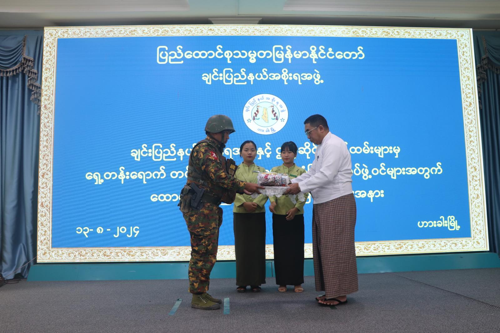 ချင်းပြည်နယ်အစိုးရအဖွဲ့နှင့် ဌာနဆိုင်ရာဝန်ထမ်းများမှ ရှေ့တန်းရောက် တပ်မတော်သားများနှင့် လုံခြုံရေးတပ်ဖွဲ့ဝင်များအား အခြေခံစားသောက်ကုန်များ ထောက်ပံ့ပေးအပ်ပွဲအခမ်းအနားကို သြဂုတ်လ ၁၃ ရက် မွန်းလွဲ ၁ နာရီခွဲက ဟားခါးမြို့၊ ချင်းပြည်နယ်အစိုးရအဖွဲ့ရုံးရှိ ပြည်နယ် အထွေထွေအုပ်ချုပ်ရေးဦးစီးဌာန၊ အစည်းအဝေးခန်းမ၌ ကျင်းပရာ ပြည်နယ်ဝန်ကြီးချုပ် ဒေါက်တာဝုန်ဆွန်းထန်၊ ပြည်နယ်ဝန်ကြီးများ၊ ပြည်နယ်ဥပဒေချုပ်၊ ပြည်နယ်အစိုးရအဖွဲ့ အတွင်းရေးမှူး၊ အမှတ် (၂၆၆) ခြေလျင်တပ်ရင်း၊ တပ်ရင်းမှူး၊ ပြည်နယ်အဆင့်ဌာနဆိုင်ရာ တာဝန်ရှိသူများနှင့် တပ်ဖွဲ့ဝင်များတက်ရောက်ကြသည်။