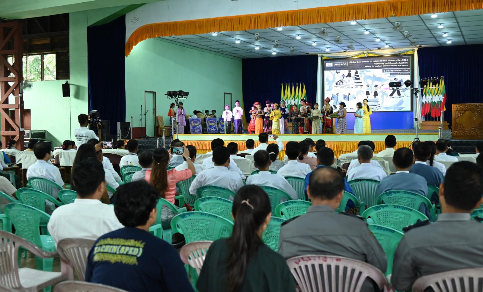 “အပြန်အလှန်နားလည်မှုနှင့် ငြိမ်းချမ်းရေးအတွက် စာတတ်မြောက်ရန် လိုအပ်လို့ ဘာသာစကားစုံ ပညာရေးကို မြှင့်တင်ကြပါစို့” ဆောင်ပုဒ်ဖြင့် ၂၀၂၄ ခုနှစ်၊ စက်တင်ဘာ ၈ ရက်နေ့တွင် ကျရောက်သည့် နိုင်ငံတကာ စာတတ်မြောက်ရေးနေ့ အထိမ်းအမှတ် အခမ်းအနားကို ယမန်နေ့ ၉ နာရီက ကချင်ပြည်နယ်၊ မြစ်ကြီးနားမြို့ ပြည်သူ့အားကစားကွင်းအတွင်းရှိ မိုးလုံလေလုံ အားကစားခန်းမ၌ ကျင်းပပြုလုပ်ရာ အခြေခံပညာလေ့ကျင့်ရေး အလယ်တန်းကျောင်းမှ ကျောင်းသား/ ကျောင်းသူလေးများက “ဝ.ထ.က.လ.သ” သီချင်းဖြင့် ဂုဏ်ပြုသီဆို ဖွင့်လှစ်ကြသည်။
