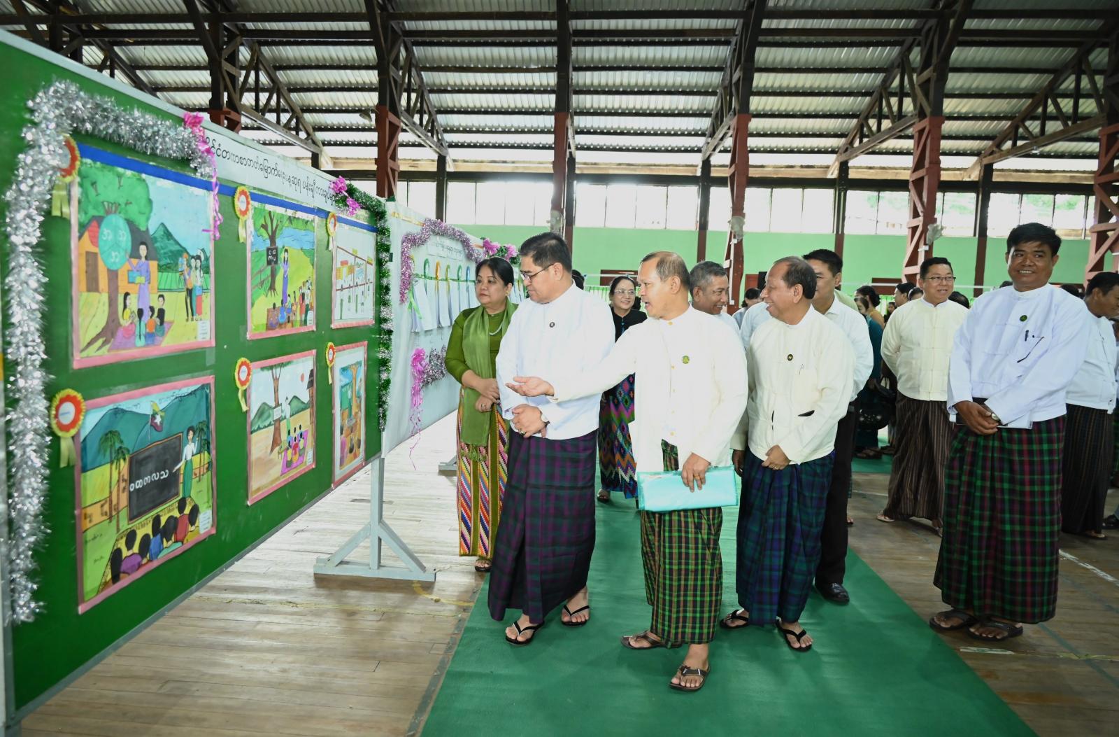 ဆက်လက်၍ ပြည်နယ်ဝန်ကြီးချုပ်က နိုင်ငံတကာ စာတတ်မြောက်ရေးနေ့ အထိမ်းအမှတ် အခြေခံပညာအထက်တန်းနှင့် အလယ်တန်းအဆင့် စာစီစာကုံး၊ ပန်းချီ၊ ပိုစတာ၊ ကဗျာပြိုင်ပွဲများတွင် ဆုရရှိခဲ့ကြသော ကျောင်းသား/ ကျောင်းသူ (၁၈)ဦးတို့အား ဂုဏ်ပြုဆုတံဆိပ်နှင့် ဂုဏ်ပြုချီးမြှင့်ငွေ များကိုလည်းကောင်း၊ အခမ်းအနား ဖျော်ဖြေရေးအစီအစဉ်တွင် ပါဝင်ခဲ့သော ကျောင်းသား/ကျောင်းသူများအတွက် ချီးမြှင့်ငွေကျပ် ၅ သိန်းကိုလည်းကောင်း ပေးအပ်ခဲ့ပြီး ပြည်နယ်ဝန်ကြီးချုပ်နှင့် ဇနီး၊ ပြည်နယ်တရားလွှတ်တော်တရားသူကြီးချုပ်၊ ပြည်နယ်ဝန်ကြီးများနှင့် ၎င်းတို့၏ ဇနီးများ၊ တာဝန်ရှိသူများက ခန်းမအတွင်း ဖွင့်လှစ်ပြသထားသည့် ပြခန်းငယ်အား ကျောင်းသား/ကျောင်းသူများနှင့်အတူ လှည့်လည်ကြည့်ရှုအားပေးခဲ့ကြသည်။