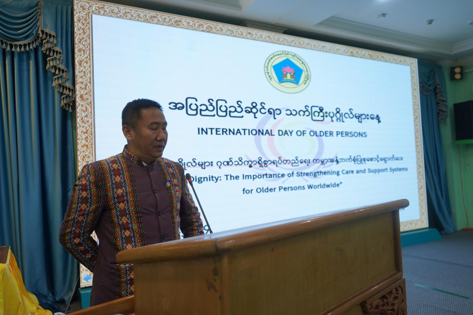 ဦးစွာ ချင်းပြည်နယ်လူမှုရေးရာဝန်ကြီး ဦးဝင်းဇော်ဦးက “၁၉၉၀ ပြည့်နှစ်၊ ဒီဇင်ဘာလ ၁၄ ရက်နေ့တွင် ကျင်းပပြုလုပ်သည့် ကုလသမဂ္ဂအထွေထွေညီလာခံက နှစ်စဉ် အောက်တိုဘာလ ၁ ရက်နေ့ကို အပြည်ပြည်ဆိုင်ရာသက်ကြီးပုဂ္ဂိုလ်များနေ့အဖြစ် ဂုဏ်ပြုသတ်မှတ်ခဲ့ခြင်းဖြစ်ရာ ယခုဆိုလျှင် (၃၄)နှစ်ရှိပြီဖြစ်ကြောင်း၊ ဖွံ့ဖြိုးဆဲနိုင်ငံများ၌ ၂၀၃၀ ပြည်နှစ်အရောက်တွင် သက်ကြီးပုဂ္ဂိုလ်အရေ အတွက်သည် လူငယ်ဦးရေထက် ပိုမိုများပြားလာမည်ဟု ခန့်မှန်းထားရာ ကျွန်ုပ်တို့၏ကမ္ဘာကို သက်ကြီးသူတို့ကမ္ဘာဟု တင်စားခေါ်ဆိုနေကြပြီး မြန်မာနိုင်ငံတွင် အသက်(၆၀)နှစ်နှင့်အထက် သက်ကြီးပုဂ္ဂိုလ်ပါဝင်မှုရာခိုင်နှုန်းသည် ၁၉၇၃ ခုနှစ်က ၆ ရာခိုင်နှုန်းရှိရာမှ ၂၀၁၉ ခုနှစ်တွင် ၁၀ ဒသမ ၁ ရာခိုင်နှုန်း တိုးလာသည်ကို တွေ့ရှိရပါကြောင်း၊ မြန်မာနိုင်ငံအနေဖြင့် သက်ကြီးရွယ်အိုများဆိုင်ရာ ဥပဒေ (၂၀၁၆) နှင့် နည်းဥပဒေများ (၂၀၂၂) ကို ပြဌာန်းခဲ့ပြီးဖြစ်ရာ သက်ကြီးပုဂ္ဂိုလ်များအနေဖြင့် အဆိုပါဥပဒေအရ သက်ကြီးပုဂ္ဂိုလ်များဆိုင်ရာ အခွင့်အရေးများကို ခံစားနိုင်မှာဖြစ်ကြောင်း၊ ထို့ကြောင့် ကျွန်ုပ်တို့၏ ဘိုးဘွား၊ မိဘများကို စိတ်ထောင်းကိုယ်ကြေ၊ အိုဇာတာကံစေသူများမဖြစ်စေဘဲ စိတ်ပျိုကိုယ်နုဇရာကို အံတုနိုင်သူများဖြစ်စေရန် အတတ်နိုင်ဆုံး အားပေးမြှင့်တင် ဖြည့်ဆည်းရေးမှာ နိုင်ငံတော်အစိုးရနှင့် မျိုးဆက်သစ်တို့၏ တာဝန်ဖြစ်ပါကြောင်းဖြင့်” အမှာစကားပြောကြားသည်။