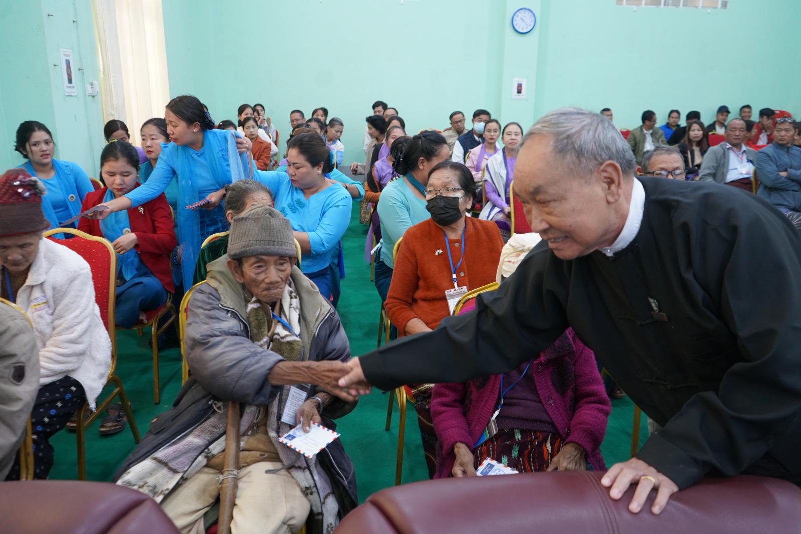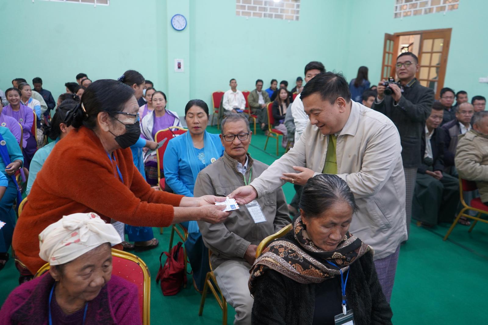 ယင်းနောက် ဟားခါးမြို့၊ ဗေသလဘိုးဘွားရိပ်သာအတွက် လှူဒါန်းငွေနှင့် ပြည်သူ့ကျန်းမာရေးဦးစီးဌာနမှ ဘိုးဘွားများအတွက် လှူဒါန်းသောဆေးဝါးများကို ပြည်နယ်လူမှုရေးရာဝန်ကြီး ဦးဝင်းဇော်ဦးက ပေးအပ်ရာ ဟားခါးမြို့၊ ဗေသလဘိုးဘွားရိပ်သာ ဂေဟာမှူးနှင့် ပြည်နယ်လူမှုဝန်ထမ်းဦးစီးဌာန ပြည်နယ်ဦးစီးမှူး ဦးနေဝါထွန်းတို့က လက်ခံရယူရာ ပြည်နယ်လူမှုရေးရာဝန်ကြီး၊ ပြည်နယ်ဥပဒေချုပ်၊ ပြည်နယ်အစိုးရအဖွဲ့အတွင်းရေးမှူးနှင့် မိခင်နှင့်ကလေးအသင်းအဖွဲ့နှင့် အမျိုးသမီးရေးရာအဖွဲ့တို့က သက်ကြီးပုဂ္ဂိုလ် (၂၀) ဦးအား ဂါရဝပြုထောက်ပံ့ငွေများ ပေးအပ်ခဲ့ကြောင်း သိရသည်။