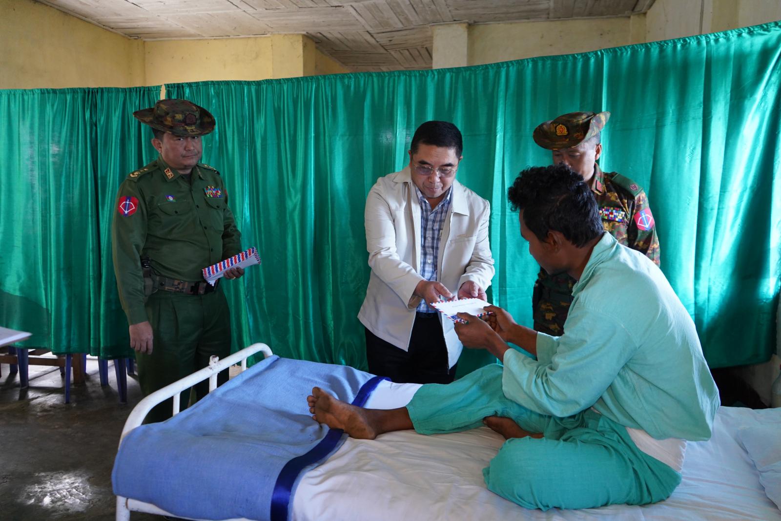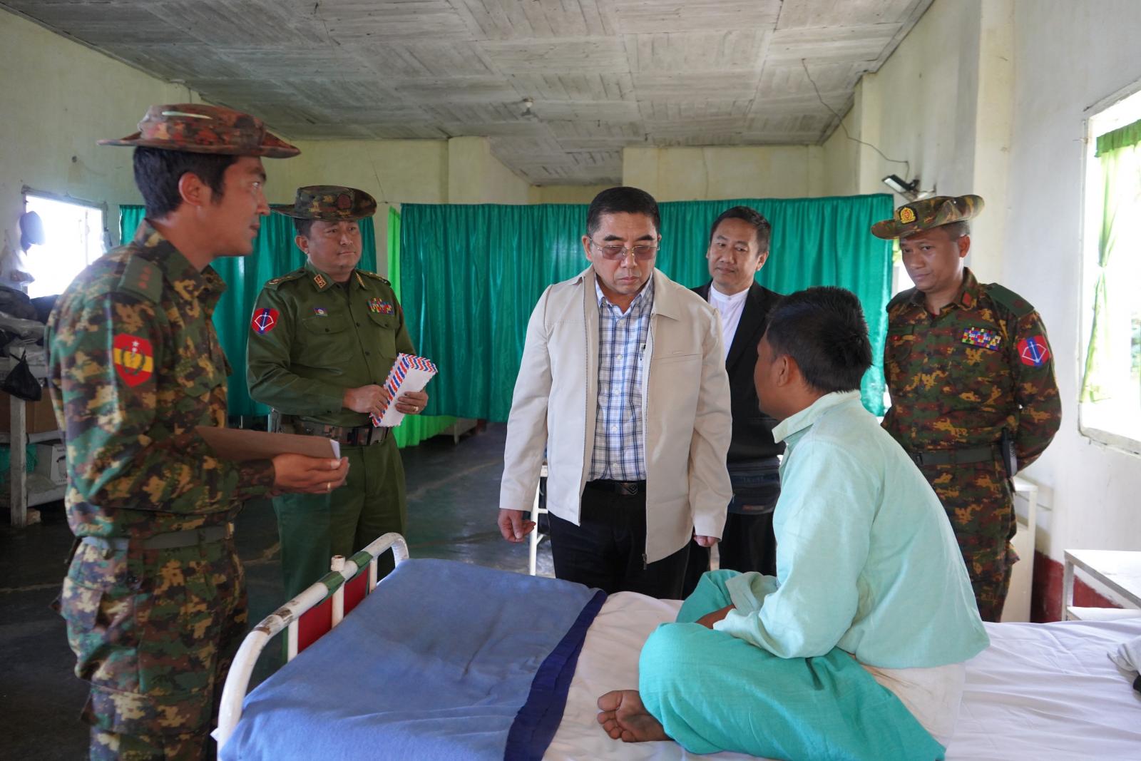 ထိုသို့ စစ်ဗျူဟာအခြေချ(ဟားခါး) တပ်နယ်အမှတ်(၁) နယ်လှည့်စစ်မြေပြင် ဆေးတပ်စု ကုတင် ၂၀ တွင် ဆေးရုံတက်ရောက်ကုသနေသော အရာရှိစစ်သည်များအား ထောက်ပံ့ငွေများပေးအပ်ရာတွင် ချင်းပြည်နယ်ဝန်ကြီးချုပ် ဒေါက်တာဝုန်ဆွန်းထန်နှင့်အတူ အနောက်မြောက်တိုင်းစစ်ဌာနချုပ်၊ ဒုတိယတိုင်းမှူး ဗိုလ်မှူးချုပ် မိုးဟိန်း၊ လုံခြုံရေးနှင့်နယ်စပ်ရေးရာဝန်ကြီး ဗိုလ်မှူးကြီး သိန်းထွန်းအောင်၊ လူမှုရေးရာဝန်ကြီး ဦးဝင်းဇော်ဦးနှင့် ပြည်နယ်အစိုးရအဖွဲ့အတွင်းရေးမှူး ဦးအောင်ချိုတို့က ကြည့်ရှုအားပေးစကားပြောကြားခဲ့ပြီး စစ်ဗျူဟာအခြေချ(ဟားခါး) တပ်နယ်အမှတ်(၁) နယ်လှည့်စစ်မြေပြင် ဆေးတပ်စု ကုတင် ၂၀ မှ ဆရာဝန်များက ဆေးရုံတက်ရောက်ကုသနေသော အရာရှိစစ်သည်တစ်ဦးချင်းစီ၏ ကျန်းမာရေးအခြေအနေကို အသေးစိတ်ရှင်းပြခဲ့ပြီး ပြည်နယ်ဝန်ကြီးချုပ်က ဆရာဝန်အားလက်ဆောင်ခြင်းပေးအပ်ခဲ့ကြောင်း သိရသည်။