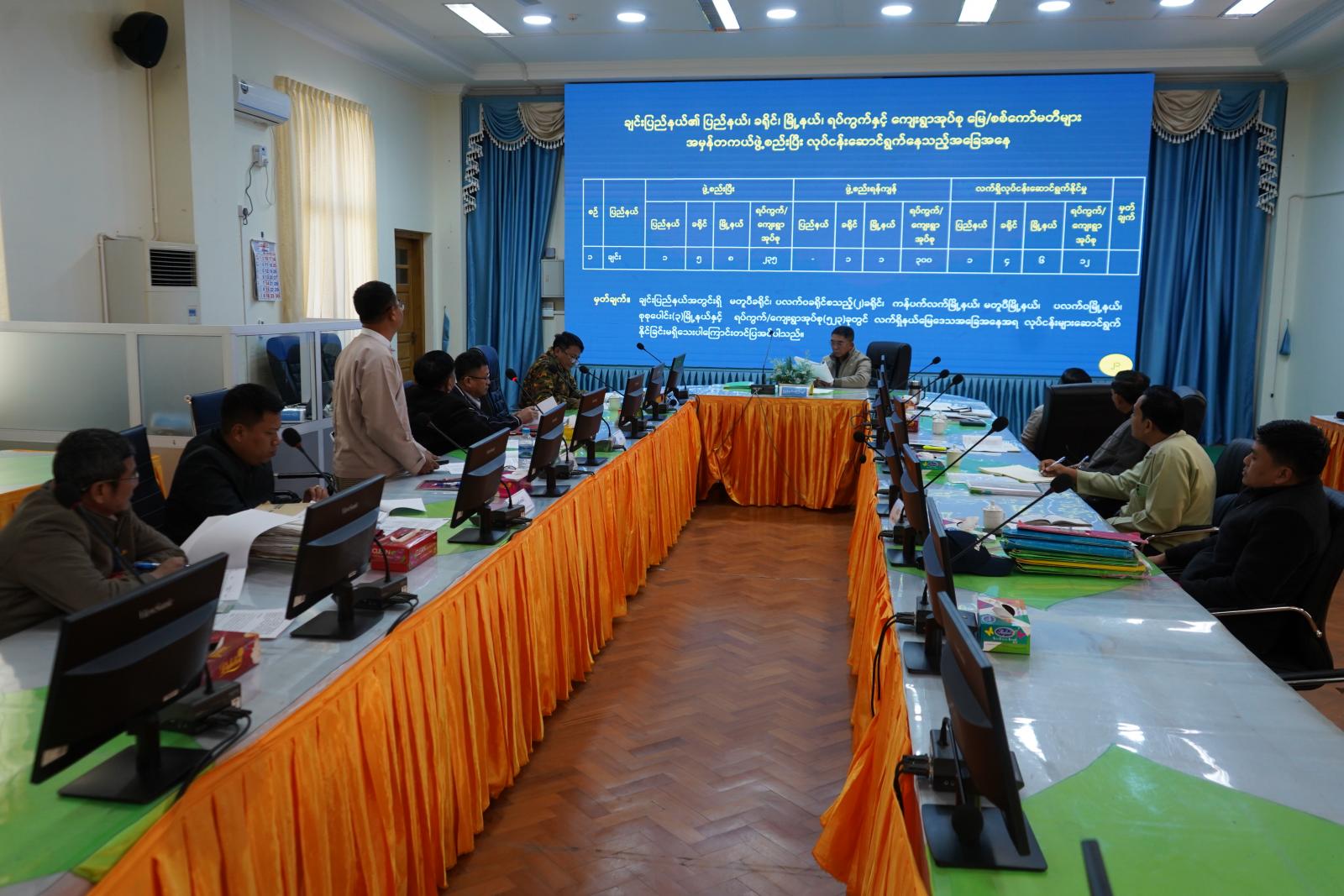 ပြည်နယ်လယ်ယာမြေနှင့် အခြားမြေများသိမ်းဆည်းခြင်းခံရမှုများ ပြန်လည်စိစစ်ရေးကော်မတီ တွဲဖက်အတွင်းရေးမှူး ပြည်နယ်မြေစာရင်းဦးစီးဌာနမှူးက စိစစ်ရန် တိုင်ကြားသည့် အမှုတွဲ (၇) တွဲအား တစ်ခုချင်းအလိုက် စိစစ်ဆောင်ရွက်ထားရှိမှုအခြေအနေကို Power Point ဖြင့် ရှင်းလင်းတင်ပြသည်။