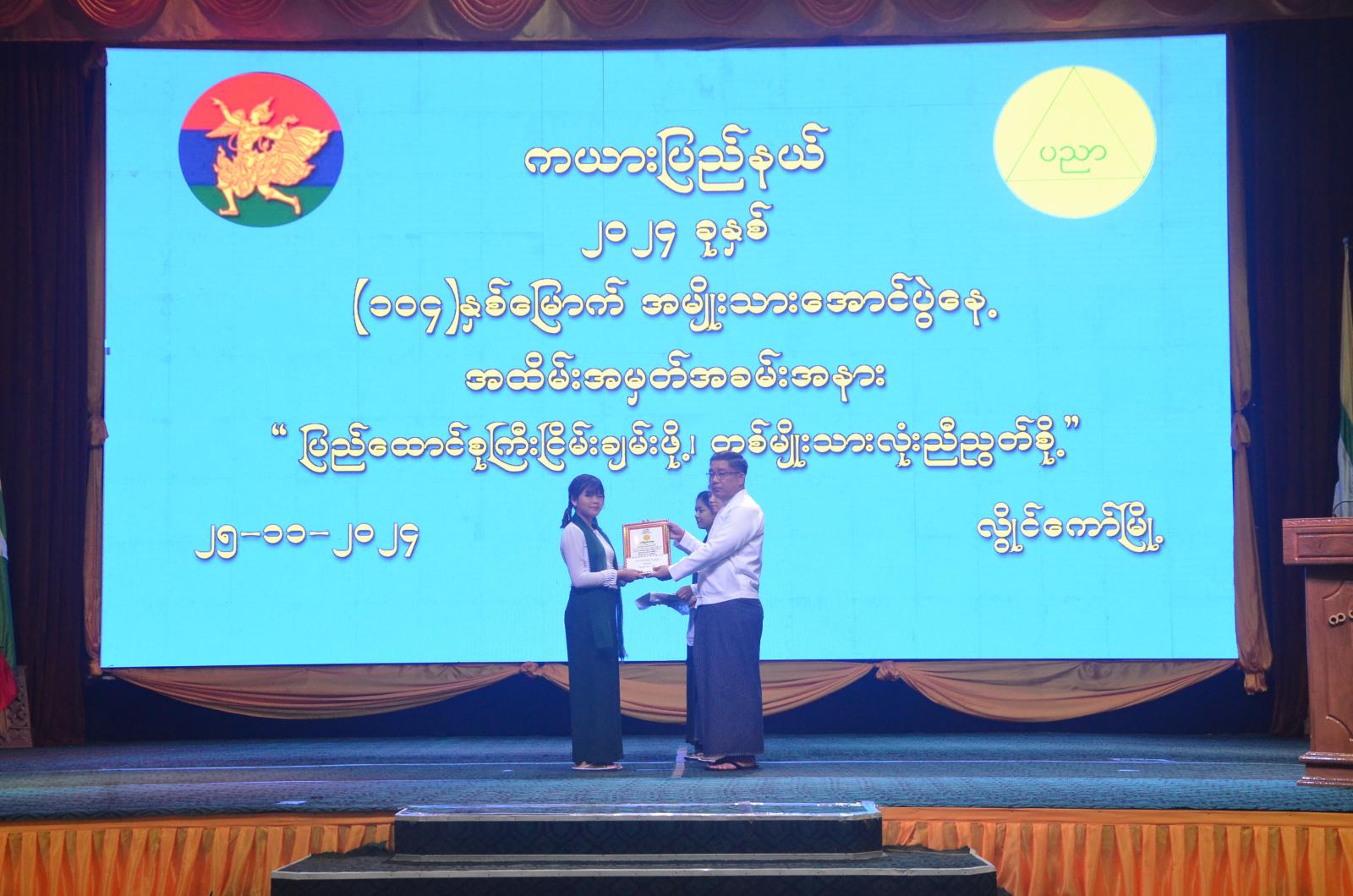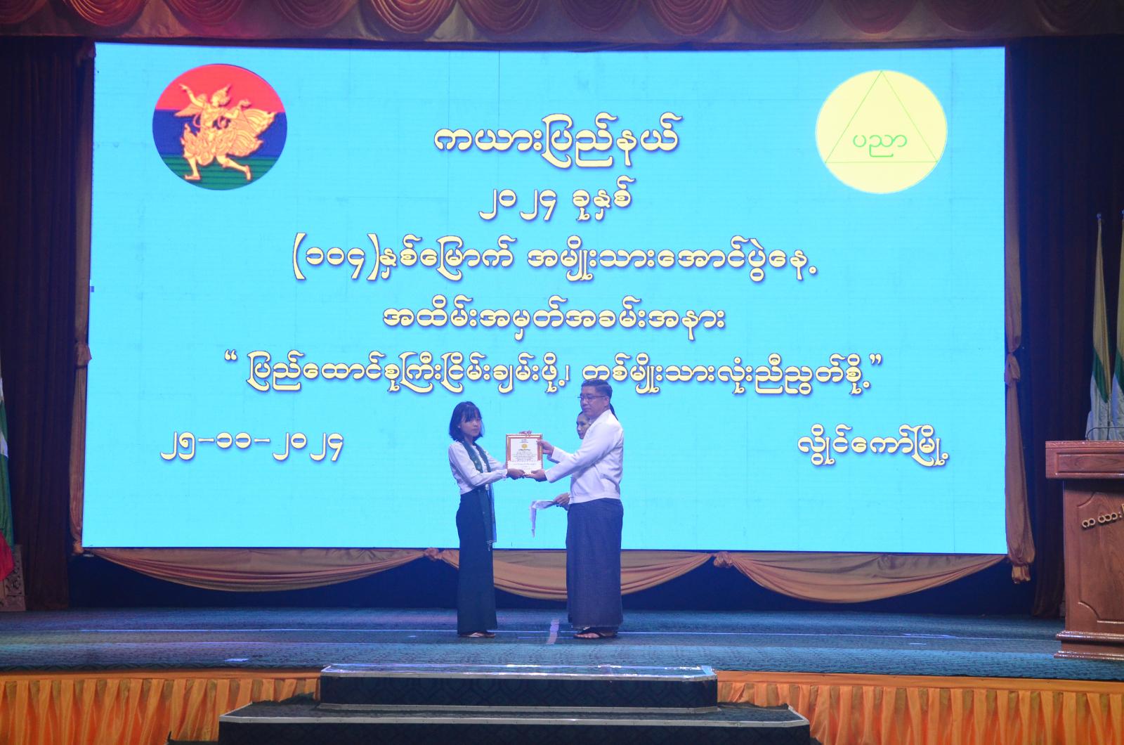 ဆက်လက်၍ (၁၀၄) နှစ်မြောက် အမျိုးသားအောင်ပွဲနေ့အထိမ်းအမှတ် စာစီစာကုံးနှင့် ကဗျာပြိုင်ပွဲများတွင် ဆုရရှိကြသော အခြေခံပညာအထက်တန်းနှင့် အလယ်တန်းအဆင့် ကျောင်းသား/ကျောင်းသူများအား ပြည်နယ်ဝန်ကြီးချုပ်၊ ဒေသကွပ်ကဲရေးမှူးနှင့် စီးပွားရေးရာဝန်ကြီးတို့က ဆုများအသီးသီးချီးမြှင့်ခဲ့ကြသည်။ ယင်းနောက် အမှတ်(၁) အခြေခံပညာအထက်တန်းကျောင်းမှ ကျောင်းသား/ကျောင်းသူများက မြန်မာ့ကျောင်းသီချင်းဖြင့် သီဆိုဖျော်ဖြေခဲ့ပြီး သီဆိုဖျော်ဖြေခဲ့ကြသော ကျောင်းသား/ကျောင်းသူများအား ပြည်နယ်အစိုးရအဖွဲ့အတွင်းရေးမှူးက ဂုဏ်ပြုဆုငွေများ ပေးအပ်ချီးမြှင့်ခဲ့သည်။