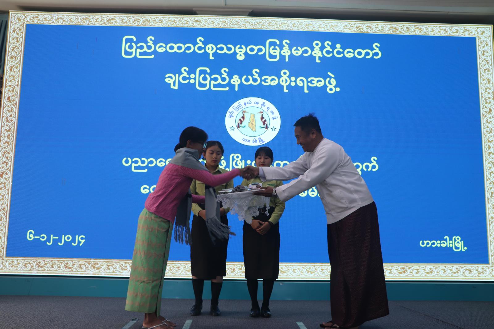 ထို့နောက် ချင်းပြည်နယ်ပညာရေးမှူးရုံးမှ ဒုတိယညွှန်ကြားရေးမှူး ဦးဗန်ရိုထန်းက ချင်းပြည်နယ်၏ ပညာရေးကဏ္ဍနှင့်ပတ်သက်၍ ဆောင်ရွက်ထားရှိမှုအခြေအနေများကို ရှင်းလင်းတင်ပြပြီး နယ်စပ်ရေးရာဝန်ကြီးဌာန၊ ပြည်ထောင်စုဝန်ကြီးက ထောက်ပံ့ပေးပို့သော ချင်းပြည်နယ်အတွင်း ပညာသင်ကြားနေသည့် ကျောင်းသား၊ ကျောင်းသူများအတွက် ကျောင်းသုံးဗလာစာအုပ် (၁၅၀)ဒါဇင်နှင့် ကျောင်းဝတ်စုံ (၁၅၀)စုံကို လုံခြုံရေးနှင့်နယ်စပ်ရေးရာဝန်ကြီး ဗိုလ်မှူးကြီးသိန်းထွန်းအောင်ကလည်းကောင်း၊ ဟားခါးမြို့နှင့် တီးတိန်မြို့ရှိ အစိုးရစက်မှုလက်မှုသိပ္ပံကျောင်းများအတွက် အထွေထွေရန်ပုံငွေထောက်ပံ့ငွေများကို သယံဇာတရေးရာဝန်ကြီး ဦးကျော်ငြိမ်းကလည်းကောင်း၊ ဆရာ၊ ဆရာမများအတွက် သင်ကြားသင်ယူမှုအထောက်အကူပြု Video သင်ခန်းစာ Memory Stick များကို လူမှုရေးရာဝန်ကြီး ဦးဝင်းဇော်ဦးကလည်းကောင်း ပေးအပ်ချီးမြှင့်ကြရာ တာဝန်ရှိသူများက လက်ခံရယူကြသည်။