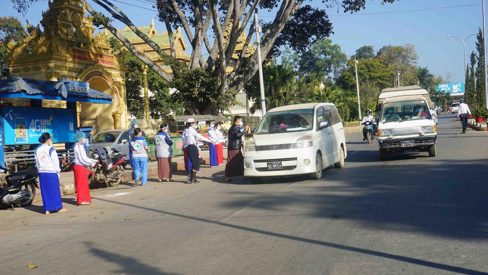 ဆက်လက်၍ မိုင်းလုံးမီးပွိုင့် နှင့် မြို့လယ်နာရီတို့တွင် ပါးစပ်နှာခေါင်းစည်း(Mask)တပ်ဆင်ခြင်းမရှိသည့် လမ်းသွား၊ လမ်းလာပြည်သူများအား ပါးစပ် နှာခေါင်းစည်း (Mask)များကို လိုက်လံဝေငှတပ်ဆင်စေခဲ့ပြီး အားကစားနှင့် ကာယပညာ ဦးစီးဌာနမှ Go Away Corona သီချင်းဖြင့် ကျန်းမာရေး အသိပညာ ပေး သရုပ်ဖော်မှုများဆောင်ရွက်ခဲ့သည်။
