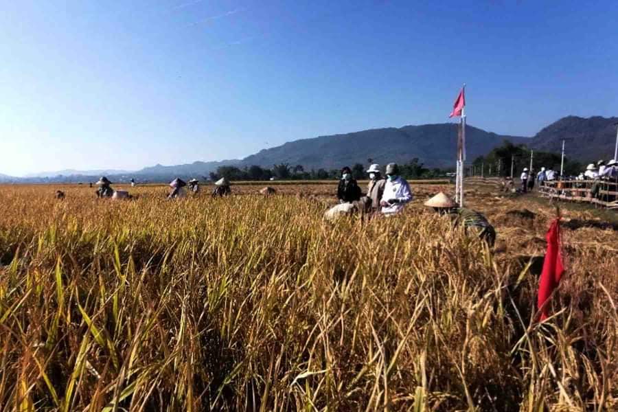 ကယားပြည်နယ် လွိုင်ကော်ခရိုင် ဒီးမော့ဆိုမြို့နယ် စိုက်ပျိုးရေးဦးစီးဌာနမှ ကိုဗစ်-၁၉ ကာလတွင် စီးပွားရေးကုစားမှု (CERP) အစီအစဉ်ဖြင့် စိုက်ပျိုးထားသည့် မိုးစပါး မျိုးစေ့ထုတ် စိုက်ခင်းစံကွက် ရိတ်သိမ်းခြင်းကို ယနေ့နံနက် ၁၀ နာရီအချိန်တွင် နန်းမယ်ခုံမြို့ ၊ ခေါ်ခုကယား ရပ်ကွက်နေ တောင်သူ ဦးဖရေးရယ်၏ လယ်မြေ၌ ဆောင်ရွက်လျက်ရှိကြောင်း သိရသည်။