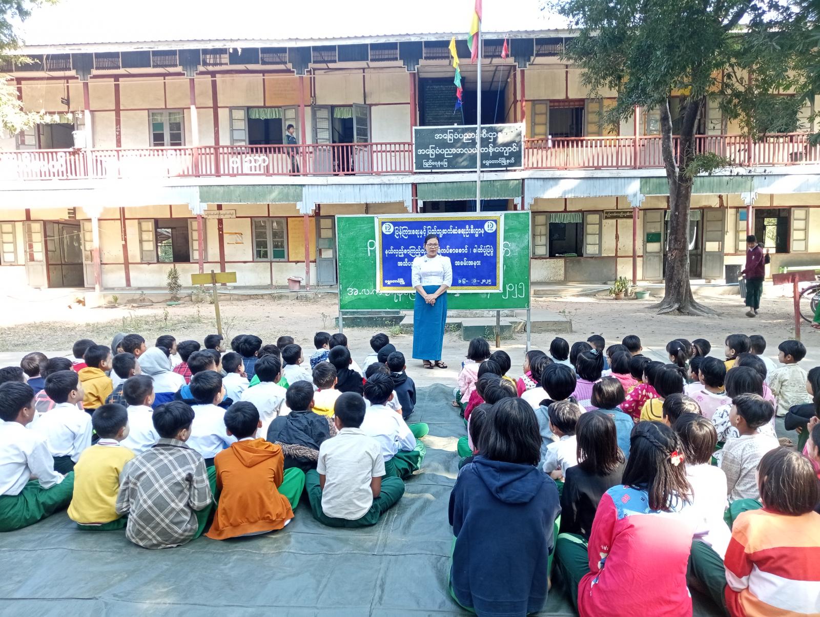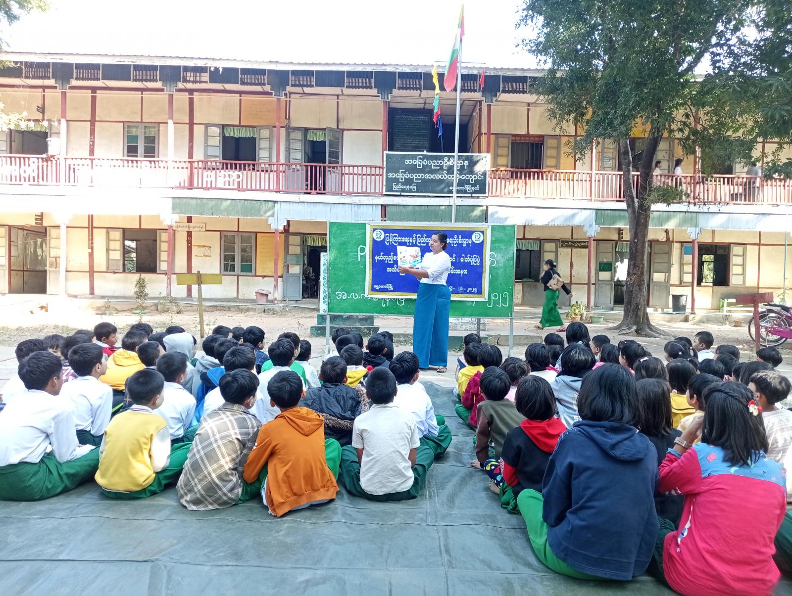 ထိုသို့ဆောင်ရွက်ရာတွင် အဆိုပါကျောင်းမှ မူလတန်းအဆင့် ကျောင်းသား၊ ကျောင်းသူလေးများအား ပြန်ကြားရေးနှင့်ပြည်သူ့ဆက်ဆံရေးဦးစီးဌာနမှ ဒုတိယဦးစီးမှူး ဒေါ်နွေးဒါလီနိုင်က လူငယ်နှင့်အနာဂတ်ရည်မှန်းချက် ကောင်းမွန်ရေးခေါင်းစဉ်ဖြင့် ဗလငါးတန်ဖွံ့ဖြိုးရေးဆိုင်ရာအကြောင်းကို အသိပညာပေးဆွေးနွေးဟောပြောပြီး "အလွန်ကြီးမားသောမုန်လာဥကြီး" ပုံပြင်စာအုပ်၊ ဒေါ်ရွှေဝတ်ရည်တိုးက "ကြက်တူရွေးနှင့်ပုရွက်ဆိတ်" ပုံပြင်စာအုပ်တို့ အသီးသီးပြောကြားခဲ့သည်။