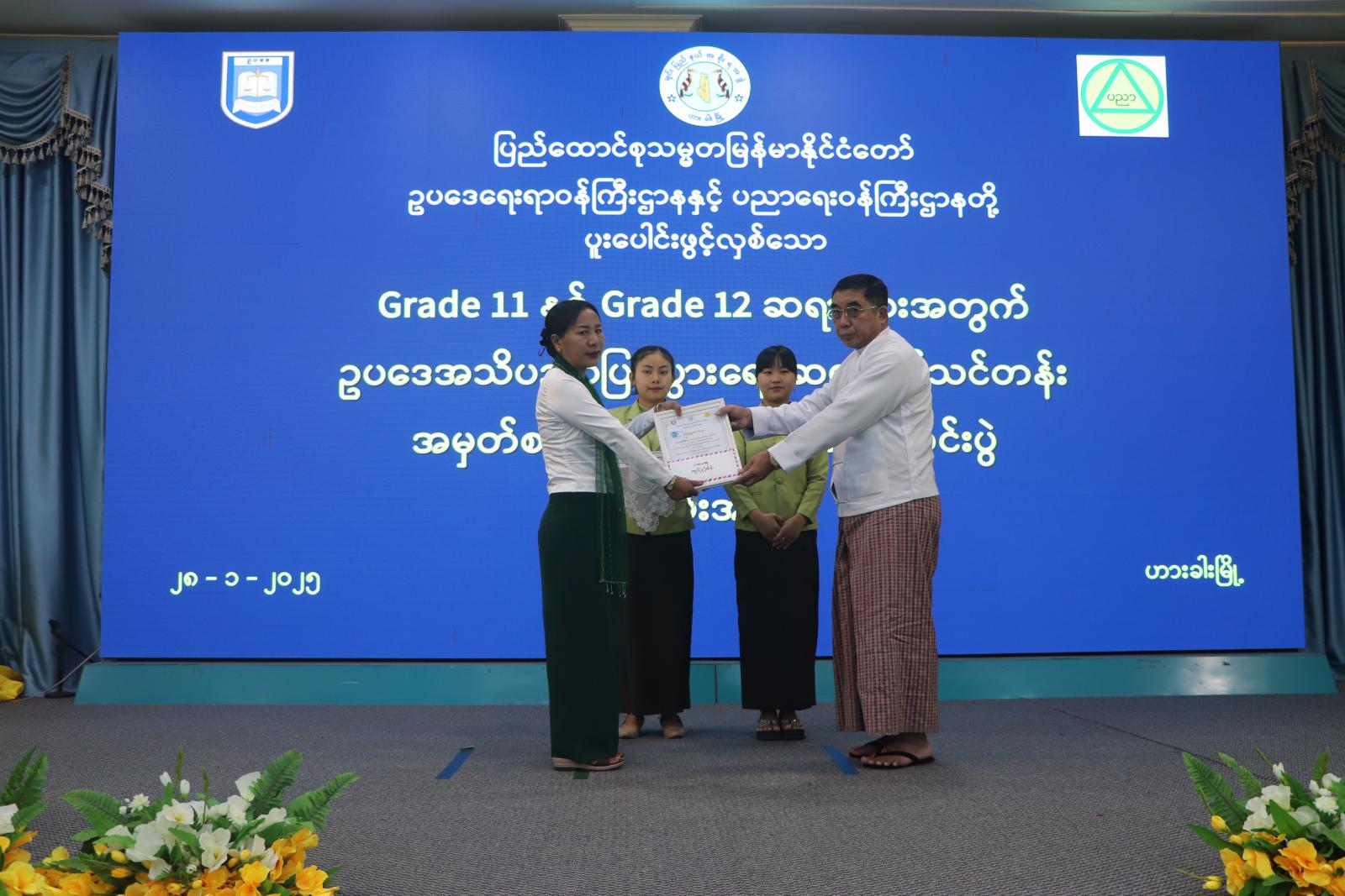 ဥပဒေရေးရာဝန်ကြီးဌာနနှင့် ပညာရေးဝန်ကြီးဌာနတို့ ပူးပေါင်းဖွင့်လှစ်သော Grade-11 နှင့် Grade-12 ဆရာများအတွက် ဥပဒေအသိပညာပြန့်ပွားရေးဆရာဖြစ်သင်တန်း အမှတ်စဉ်(၁/၂၀၂၅) သင်တန်းဆင်းပွဲ အခမ်းအနားကို ယမန်နေ့ နံနက် ၁၀ နာရီက ဟားခါးမြို့၊ ချင်းပြည်နယ် အစိုးရအဖွဲ့ရုံးရှိ ပြည်နယ်အထွေထွေအုပ်ချုပ်ရေးဦးစီးဌာန အစည်းအဝေးခန်းမ၌ ကျင်းပရာ ချင်းပြည်နယ်ဝန်ကြီးချုပ် ဒေါက်တာဝုန်ဆွန်းထန်နှင့် ဇနီး၊ ပြည်နယ်တရားလွှတ်တော် တရားသူကြီးချုပ် ဦးနေစိုး၊ ပြည်နယ်ဝန်ကြီးများ၊ ပြည်နယ်ဥပဒေချုပ်နှင့် ၎င်းတို့၏ ဇနီးများ၊ ပြည်နယ်အဆင့်ဌာနဆိုင်ရာတာဝန်ရှိသူများနှင့် in person ဖြင့် သင်တန်းရောက်သည့် ဆရာ၊ ဆရာမများ တက်ရောက်ကြသည်။