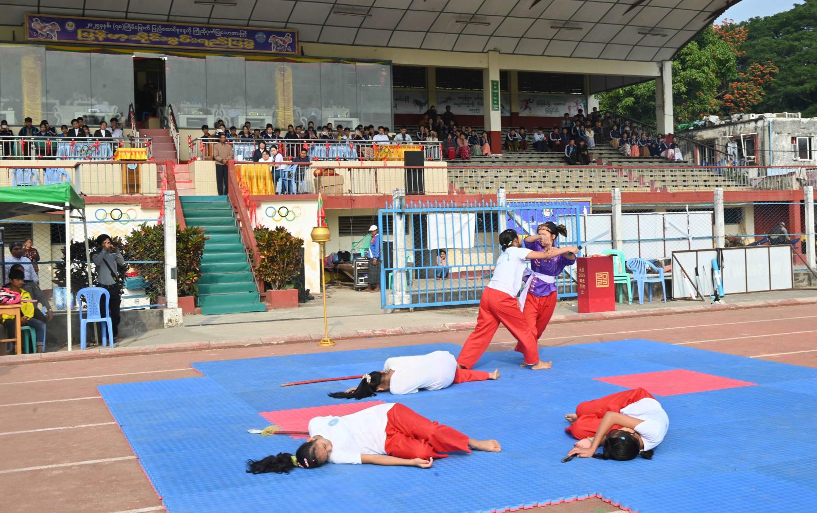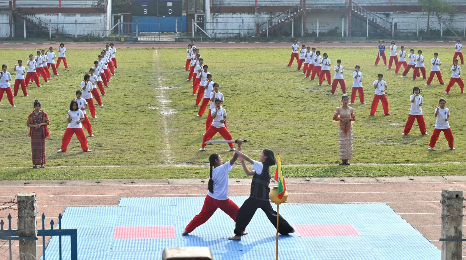 ထို့နောက် မြန်မာ့သိုင်းစွမ်းရည်များကိုပြသရာ ကျောင်းသူလေးများစုပေါင်း၍ မြန်မာ့သိုင်းစွမ်းရည် (၆၃) ကိုးမောင်းကိုလည်းကောင်း၊ ပြည်နယ်နှင့် နိုင်ငံ့လက်ရွေးစင် မြန်မာ့သိုင်းကစား သမားများနှင့် မျိုးဆက်သစ်လူငယ်များက မြန်မာ့ဓါးတစ်လက် တစ်ကိုယ်တော်စွမ်းရည်၊ လက်နက်မဲ့ဓါးရှည် ဗန်ဒို၊ အဖွဲ့လိုက်ဗန်ဒိုသိုင်း၊ အဲမောင်းလှံရှည်၊ လက်နက်မဲ့တိုက်ခိုက်ခြင်း၊ ဓားရေးအဖွဲ့လိုက်၊ မြန်မာ့ဓါးရေးဇရပ်တောင်ပျံ၊ လှံရှည်လက်နက်မဲ့၊ ဝိုင်းကြီးထွက် အဆင့်မြင့်သိုင်း၊ တုတ်ရှည်သိုင်း စသည့် သိုင်းစွမ်းရည်များကိုလည်းကောင်း၊ မြန်မာ့သိုင်းပညာရှင် ဆရာကြီးဦးချစ်သူက မြန်မာ့ဓါးရေး စွမ်းရည်ပြသမှုများကိုလည်းကောင်း အားပေးကြည့်ရှုခဲ့ကြသည်။