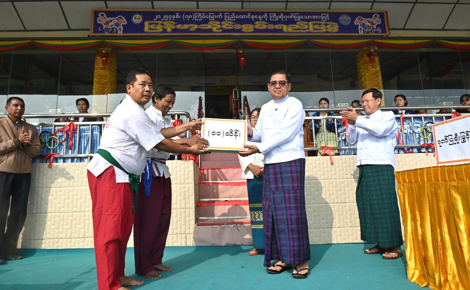 ဆက်လက်၍ ပြည်နယ်ဝန်ကြီးချုပ်က မြန်မာ့သိုင်းဆပ်ကော်မတီနှင့် စွမ်းရည်ပြအဖွဲ့များအတွက် ဂုဏ်ပြုချီးမြှင့်ငွေကျပ် (၁၀) သိန်း၊ အားကစားနှင့်ကာယပညာဦးစီးဌာနက ချီးမြှင့်ငွေကျပ် ၃ သိန်းနှင့် စွမ်းရည်ပြပြိုင်ပွဲတွင် ပါဝင်ကူညီခဲ့ကြသော ရှမ်းတိုင်းရင်းသားရိုးရာအဖွဲ့အတွက် ချီးမြှင့်ငွေများကို အသီးသီးပေးအပ်ချီးမြှင့်ခဲ့ကြသည်။