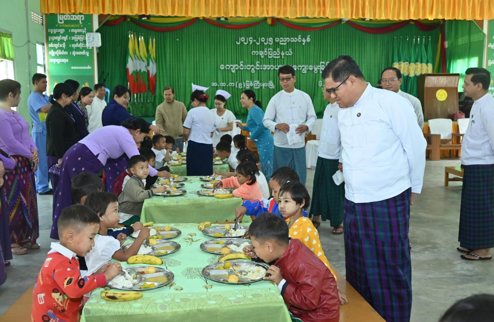 ယင်းနောက် ပြည်နယ်ဝန်ကြီးချုပ်နှင့် ဇနီးဒေါ်နန်ဆိုင်း၊ ပြည်နယ်အစိုးရအဖွဲ့ဝင်ဝန်ကြီးများနှင့် ၎င်းတို့၏ ဇနီးများ၊ ဌာနဆိုင်ရာတာဝန်ရှိသူများသည် ကျန်းမာရေးဝန်ကြီးဌာန၊ ပြည်နယ်ပြည်သူ့ ကျန်းမာရေးဦးစီးဌာနက မူလတန်းကျောင်းသား/ကျောင်းသူများ၏ ကြီးထွားဖွံ့ဖြိုးကျန်းမာမှုနှင့် ပညာရေးတိုးတက်မှုတို့အတွက် ကျန်းမာရေးနှင့်ညီညွတ်သော အစားအသောက်ပုံစံများမြှင့်တင်ရန် ပညာရေးနှင့်ကျန်းမာရေးအပါအဝင် ကဏ္ဍပေါင်းစုံ ပူးပေါင်းဆောင်ရွက်သည့် အစီအစဉ်တစ်ရပ်ဖြင့် မြစ်ကြီးနား၊ ဝိုင်းမော်၊ မိုးညှင်း၊ မိုးကောင်းမြို့နယ်များရှိ အခြေခံပညာကျောင်းများမှ မူလတန်းကလေးငယ်များအား ကျောင်းတွင်းအာဟာရကျွေးမွေးရေးအစီအစဉ်ဖြင့် ကျွေးမွေးဆောင်ရွက်လျက်ရှိရာ အမှတ် (၉) အခြေခံပညာအထက်တန်းကျောင်း၊ ရွှေသွေးခန်းမ၌ ကျောင်းသားကလေးငယ်ဦးရေ (၉၃)ဦးတို့ အားလည်းကောင်း၊ အမှတ်(၈) အခြေခံပညာအထက်တန်းကျောင်းခန်းမ၌ ကလေးငယ် ဦးရေ (၆၃) ဦးတို့အားလည်းကောင်း၊ အမှတ် (၁) အခြေခံပညာအထက်တန်းကျောင်း စာသင်ဆောင်များ၌ ကလေးငယ်ဦးရေ (၅၅) ဦးတို့အားလည်းကောင်း ကျန်းမာရေးနှင့်ညီညွတ်သည့် စားသောက်မှုပုံစံဖြင့် အာဟာရပြည့်ဝသည့် အစားအစာများကျွေးမွေးနေမှုကို လှည့်လည်ကြည့်ရှုစစ်ဆေးခဲ့ကြသည်။