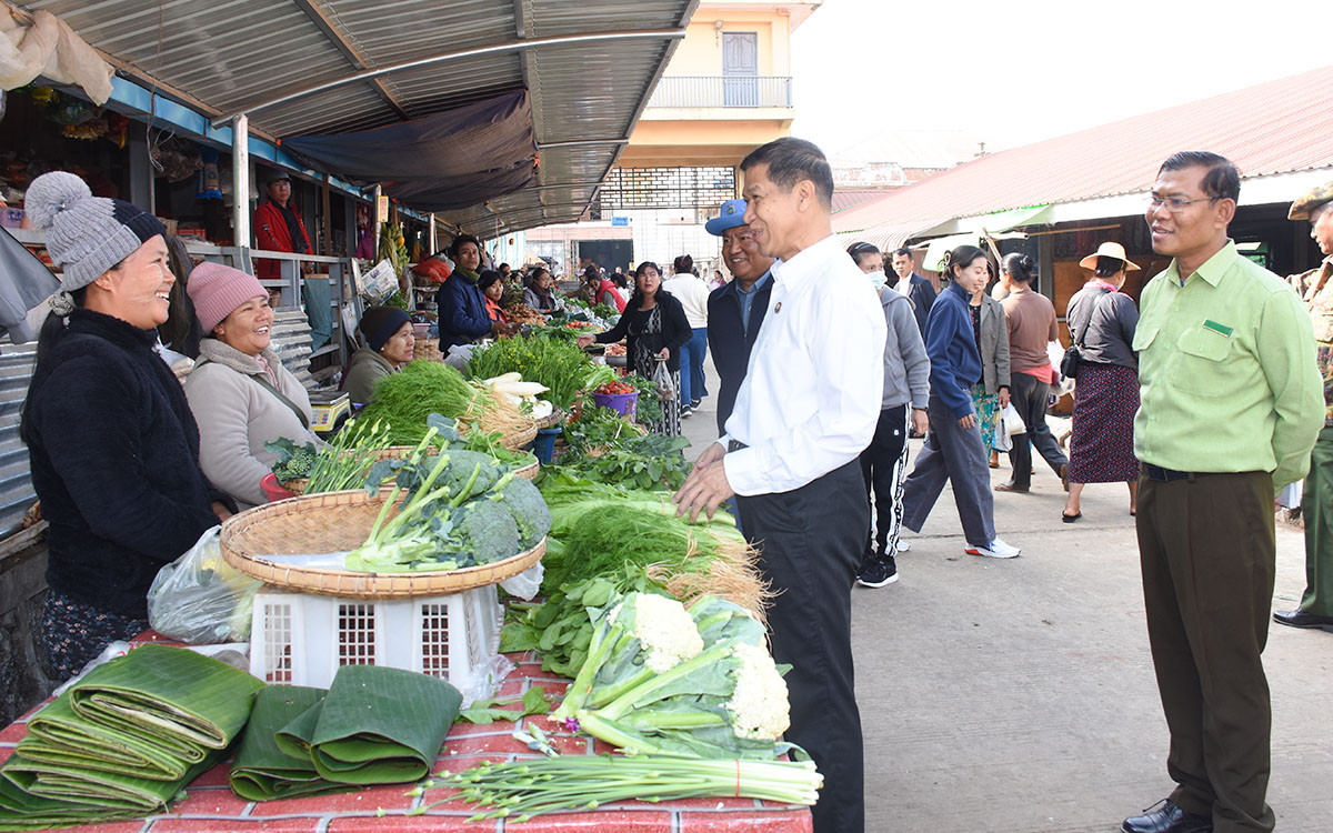 ၎င်းနောက် တိုင်းဒေသကြီးဝန်ကြီးချုပ်သည် ရပ်ကွက်ကြီး (၁၀)ရှိ သီရိရတနာဈေးသို့ ရောက်ရှိပြီး တာဝန်ရှိသူများက သီရိရတနာဈေးတွင် ညံတောဈေးမှ ဈေးသူဈေးသားများအား ယာယီနေရာ ချပေးထားမှု၊ ဈေးတွင်ရောင်းဝယ် ဖောက်ကားနေမှု အခြေအနေများကို လိုက်လံရှင်းလင်းပြသရာ တိုင်းဒေသကြီးဝန်ကြီးချုပ်က ဈေးသူ၊ဈေးသားများနှင့် ဈေးဝယ်လာပြည်သူများ အဆင်ပြေ ချောမွေ့စေရေး၊ စိတ်ချမ်းမြေ့စေရေး၊ ဈေးနှင့်ဈေးပတ်ဝန်းကျင် အစဉ်အမြဲ သန့်ရှင်းသပ်ရပ်စေရေး၊ ယာဉ်ကြောပိတ်ဆို့မှုနှင့် ရှုပ်ထွေးမှုမရှိစေရေး အလေးထားကာ စနစ်တကျ ကြပ်မတ်ဆောင်ရွက် သွားရန်တို့ကို ပြောကြားပြီးနောက် တာဝန်ရှိသူများ၏ ရှင်းလင်းတင်ပြမှုများအပေါ် လိုအပ်သည်များကို ပေါင်းစပ်ညှိနှိုင်းဖြည့်ဆည်းဆောင်ရွက်ပေးခဲ့ကြောင်း၊ ဈေးသူ၊ ဈေးသားများနှင့် ဈေးဝယ်ပြည်သူများကို ရင်းနှီးစွာ နှုတ်ဆက်အားပေးစကားများ ပြောကြားခဲ့ကြောင်း သိရသည်။
