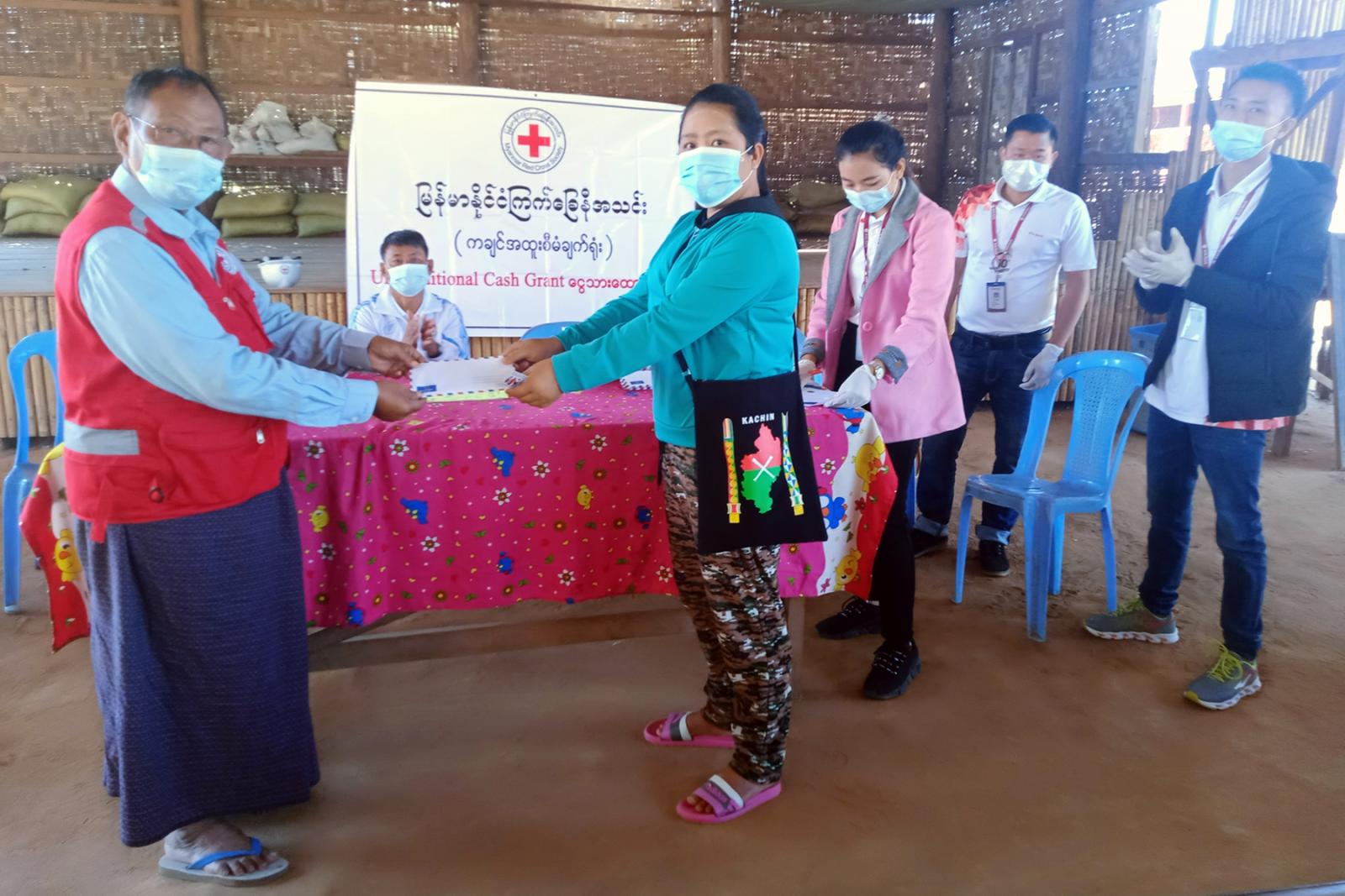 ကချင်ပြည်နယ်၊ ဗန်းမော်ခရိုင် ရွှေကူမြို့နယ် IDP Camp များရှိ နေရပ်စွန့်ခွာပြောင်းရွှေ့ နေထိုင်သော အိမ်ထောင်စုများအား မြန်မာနိုင်ငံကြက်ခြေနီအသင်း၊ ကချင်အထူး စီမံချက်ရုံးမှ ယနေ့နံနက် ၁၀ နာရီခွဲခန့်တွင် မြို့နယ်အတွင်းရှိ IDP Camp စခန်းများ၌ ဒုတိယအကြိမ် ထောက်ပံ့ငွေများ ပေးအပ်ခဲ့သည်။