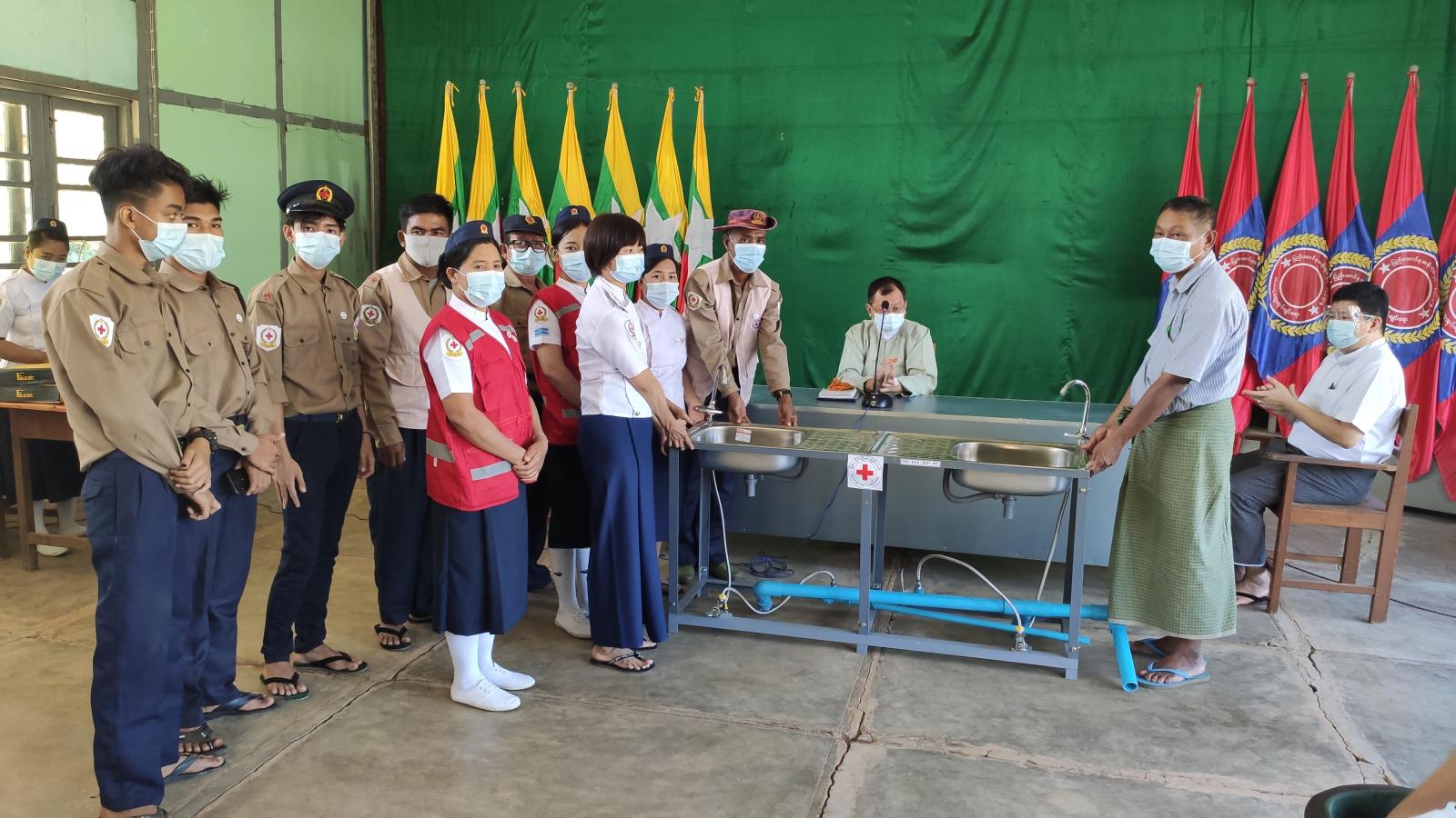 အခမ်းအနားတွင်မြို့နယ် ကိုဗစ်-၁၉ ထိန်းချုပ်ရေးနှင့် အရေးပေါ်တုံ့ပြန်ရေးကော်မတီဥက္ကဌ မြို့နယ်အုပ် ချုပ်ရေးမှူး ဦးသီဟဇော်က အဖွင့်အမှာစကားပြောကြားရာ ကိုဗစ်-၁၉ ရောဂါကြိုတင် ကာကွယ်ရေးတွင် လက်ဆေးခြင်းသည်အဓိကကျသောကာကွယ်မှုဖြစ်ကြောင်း၊ လက်ရှိလူမှုအဖွဲ့အစည်း တွင်စည်း ကမ်းလိုက်နာမှု အားနည်းနေသည်ကိုတွေ့ရှိနေရကြောင်း ဒါကြောင့်ငယ်စဉ်ကတည်းက စည်းကမ်းလိုက်နာ သော အလေ့အကျင့်ကောင်းများဖြစ်ပေါ်လာစေဖို့ လူငယ်များစုစည်းရာ အခြေခံပညာ ကျောင်းများမှစ တင်ပြီး လေ့ကျင့်သင်ကြားပေးဖို့လိုအပ်ကြောင်း ပြောကြားခဲ့ပြီး အထက(ကြို့ပင်ကောက်)၊ အထက (ရွှေပန်းတော)နှင့် အထက(လယ်တီ)ကျောင်းများမှ ကျောင်းအုပ်ကြီးများထံသို့ မြို့နယ်ကြက်ခြေနီ အသင်းမှ ခြေနင်းလက်ဆေးဘေစင်များကို လွှဲပြောင်းပေးအပ်လှူဒါန်းပေးခဲ့သည်။